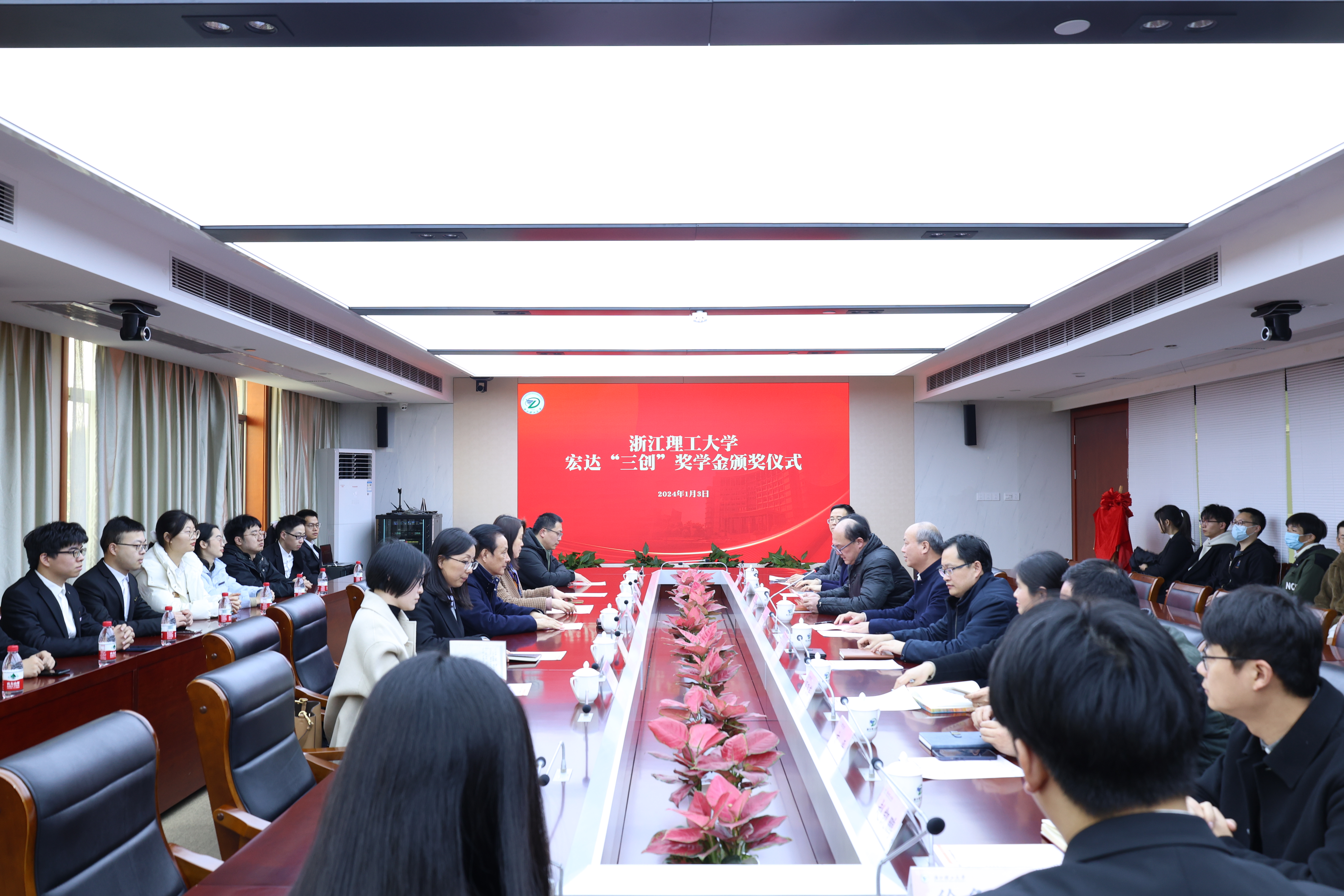1月3日,mk官方网站_mk(中国)2023年宏达“三创”奖学金颁奖仪式在1号楼215举行。宏达控股集团党委书记、董事长沈国甫,海宁中国家纺城党委书记、董事长殷晓红,校长陈文兴、校党委副书记缪鲁加出席。