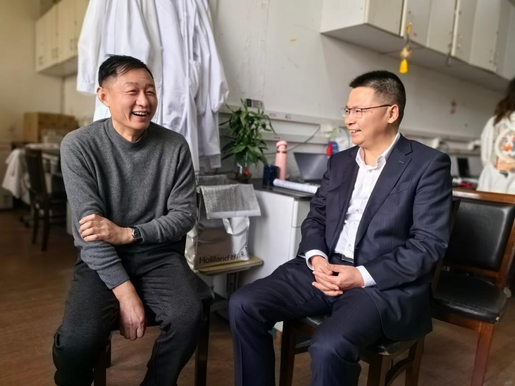 赵全军一行来到生医学院实验室,看望援疆干部郭江峰,赵全军与郭老师亲切交谈,向他送上新春的祝福,对他远离家乡、积极投身援疆事业的行为表示赞赏,还详细了解其在新疆理工学院工作、生活情况,以及带我校教研究生工作情况,勉励他不辱使命,多做贡献。郭江峰感谢学校对他的关心关爱,表示将不辱援疆初心使命,为推动民族团结、促进新疆高等教育事业发展发挥浙理工人的积极作用。