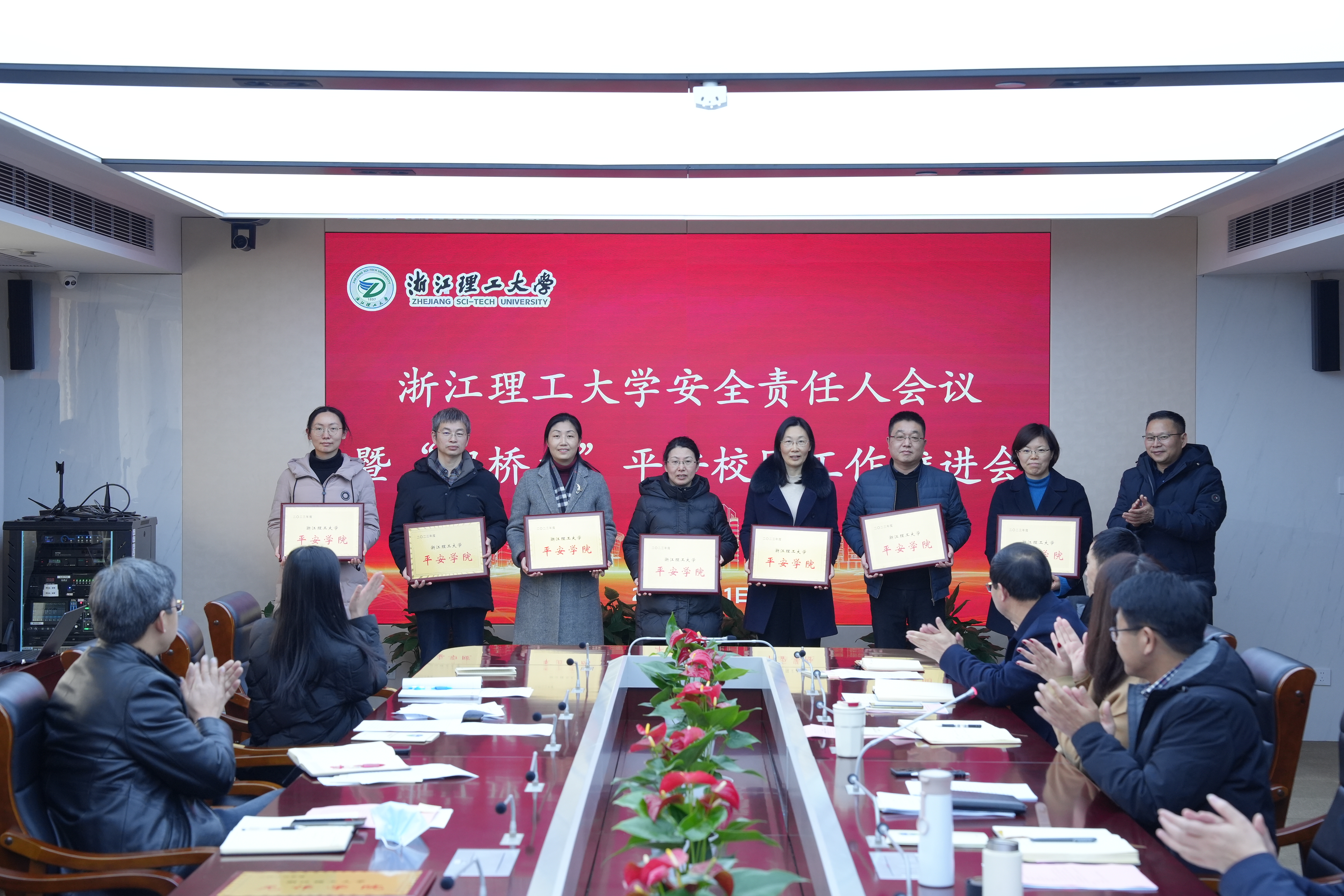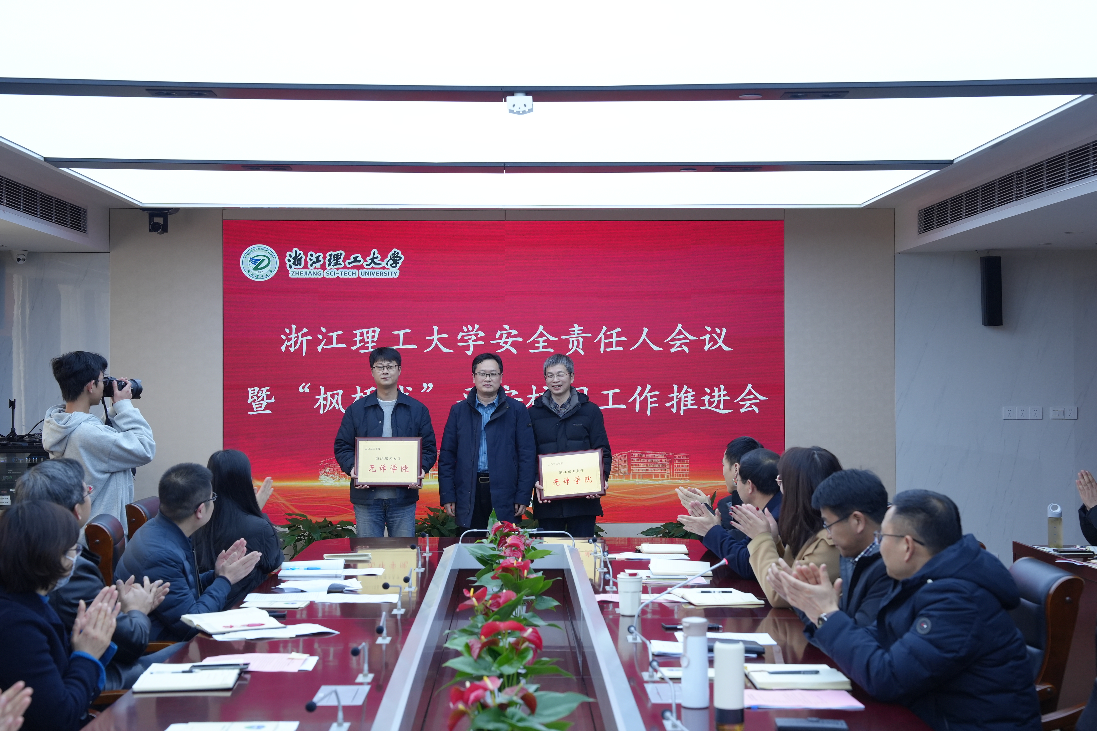 会议表彰了2023年度获得校“平安学院”和“反诈学院”荣誉称号的学院。计算机科学与技术学院,建筑工程学院,艺术与设计学院,法政学院、史量才新闻与传播学院就安全稳定工作的经验做法作了交流发言。