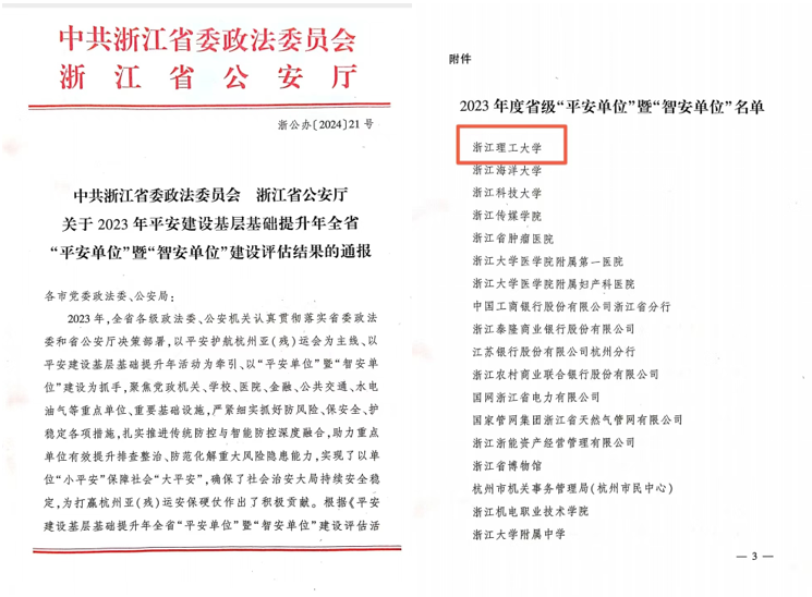 近日,中共浙江省委政法委员会 浙江省公安厅印发《关于2023年平安建设基层基础提升全省“平安单位”暨“智安单位”建设评估结果的通报》(浙公办〔2024〕21号),我校被评为浙江省省级“平安单位”暨“智安单位”。