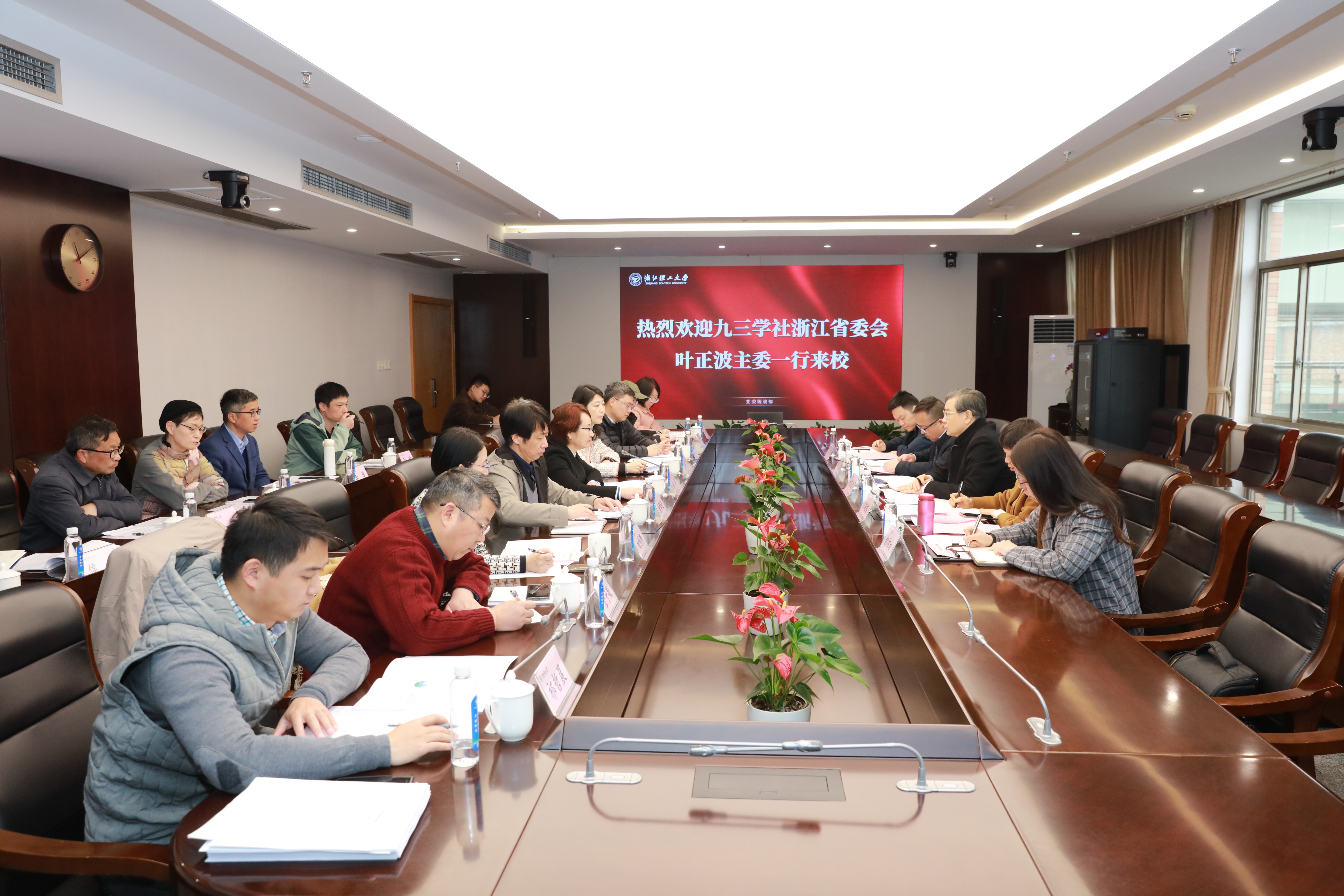 赵全军对叶正波一行的到来表示热烈欢迎,对九三学社省委会长期以来对学校工作的关怀和支持表示感谢。他简要介绍了学校基本情况,希望与九三学社省委会加强联系交流,共同凝聚力量,为浙江省全面加强“三支队伍”建设和全省经济社会发展多作贡献。