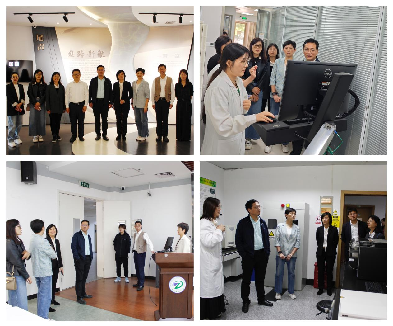 考核评估组专家实地考察学校丝绸博物馆、分析测试中心、生态染整技术教育部工程研究中心、智慧教室等场所。纺织科学与工程学院(国际丝绸学院)院长助理等陪同考察。