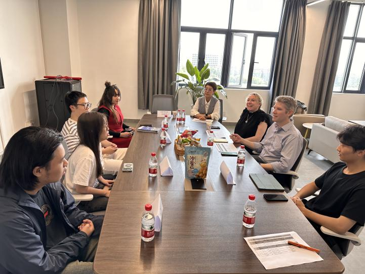 国际交流合作处和国际教育学院、国际时装技术学院相关负责人参与会见。当天下午,Helen Gaudette一行来到临平校区,与中美项目教师及学生代表开展会谈,充分听取了师生对外教课的授课反馈,详细解答了学生对于赴美交流学习的疑问,并表示将为中美项目的师生提供更多的赴美交流学习机会。会后,一行人还走访了2024届中美毕业设计联展数字时尚秀创作团队工作现场,对学院在数字化设计方面的创新表示了赞赏,也提出了两校未来在数字时尚展演方面的合作意向。学院中美合作办学项目办公室相关人员随行陪同。