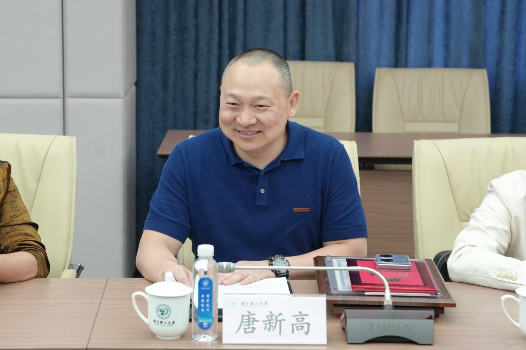 产业技术中心,对外联络办公室(校友办)、经济管理学院等部门负责人出席捐赠仪式。对外联络办公室(校友办)主任陈艳主持仪式。捐赠仪式期间,校党委书记赵全军、校长陈文兴热情会见了唐新高一行。