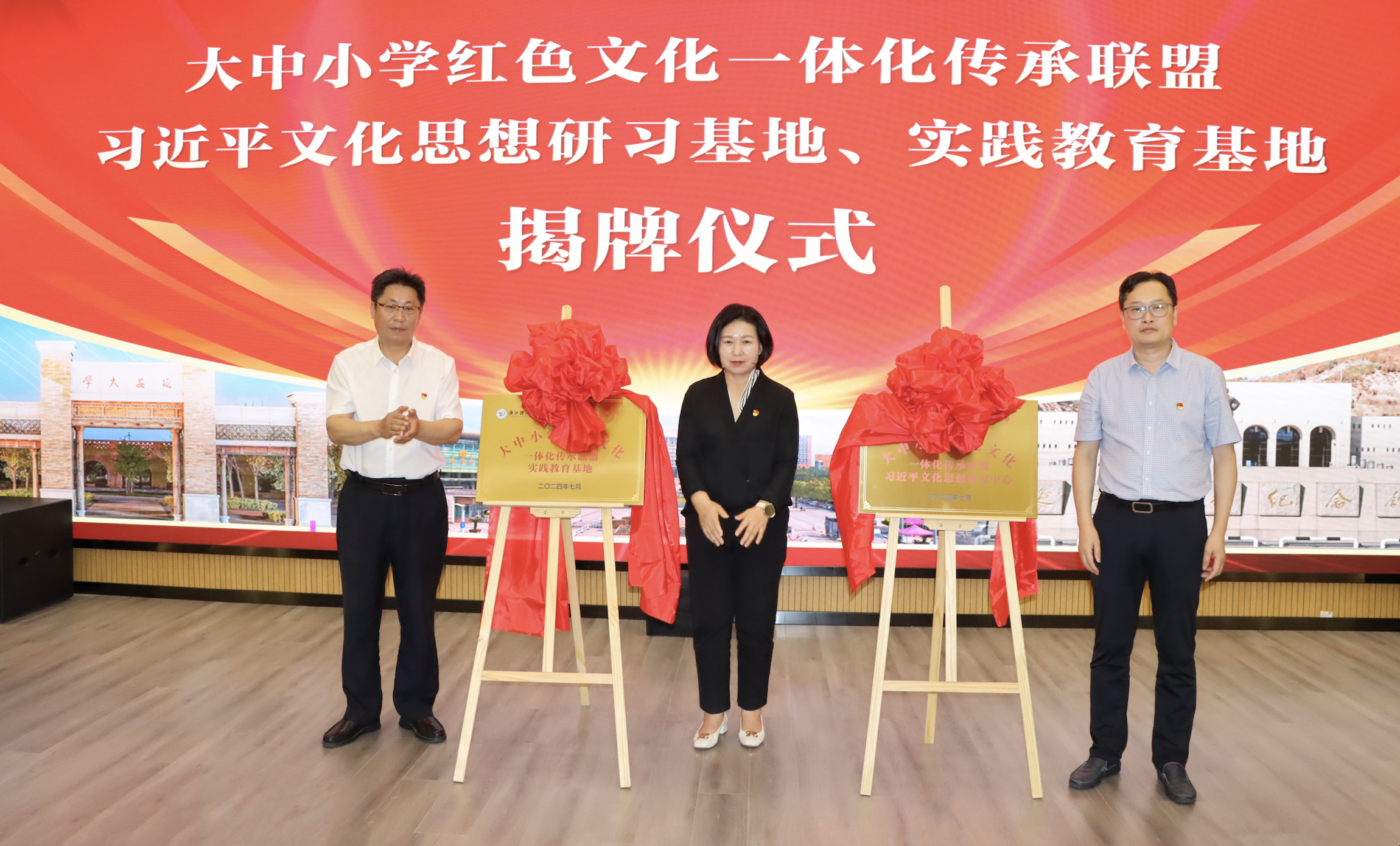 缪鲁加、吕达、刘妮为大中小学红色文化一体化传承联盟习近平文化思想研习基地、实践教育基地揭牌。