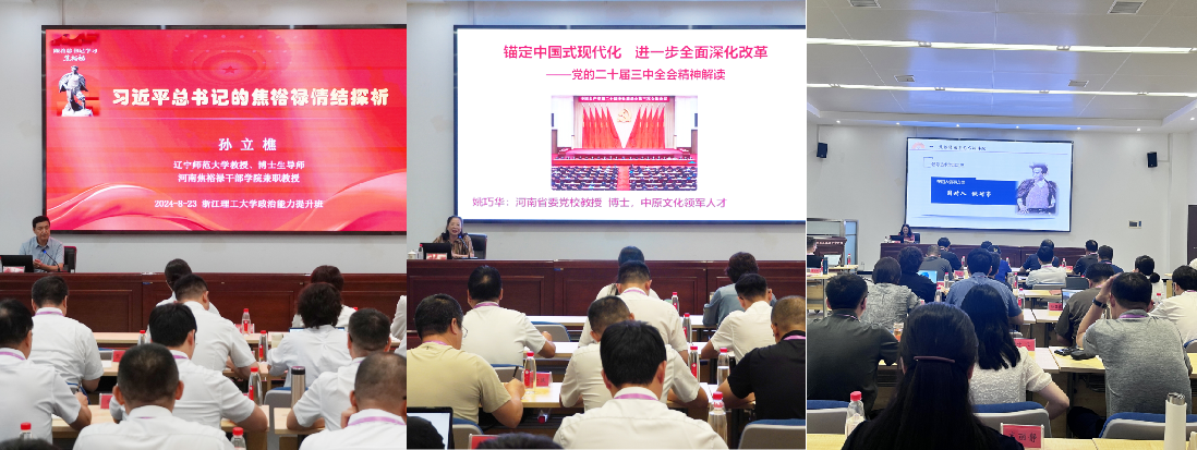 在专题讲座环节,辽宁师范大学教授、河南焦裕禄干部学院兼职教授孙立樵从焦裕禄精神的深刻内涵、影响作用、现实启示三方面深入探析习近平总书记的焦裕禄情结;河南省委党校科社部副主任、教授姚巧华紧扣党的二十届三中全会精神实质,从全面深化改革的重要性和必要性、主要内容、总目标以及六条重大原则入手,深入解读党的二十届三中全会精神;河南焦裕禄干部学院副教授、焦裕禄精神研究院研究员张冲从表现、成因和启示三个维度解析焦裕禄的领导艺术。