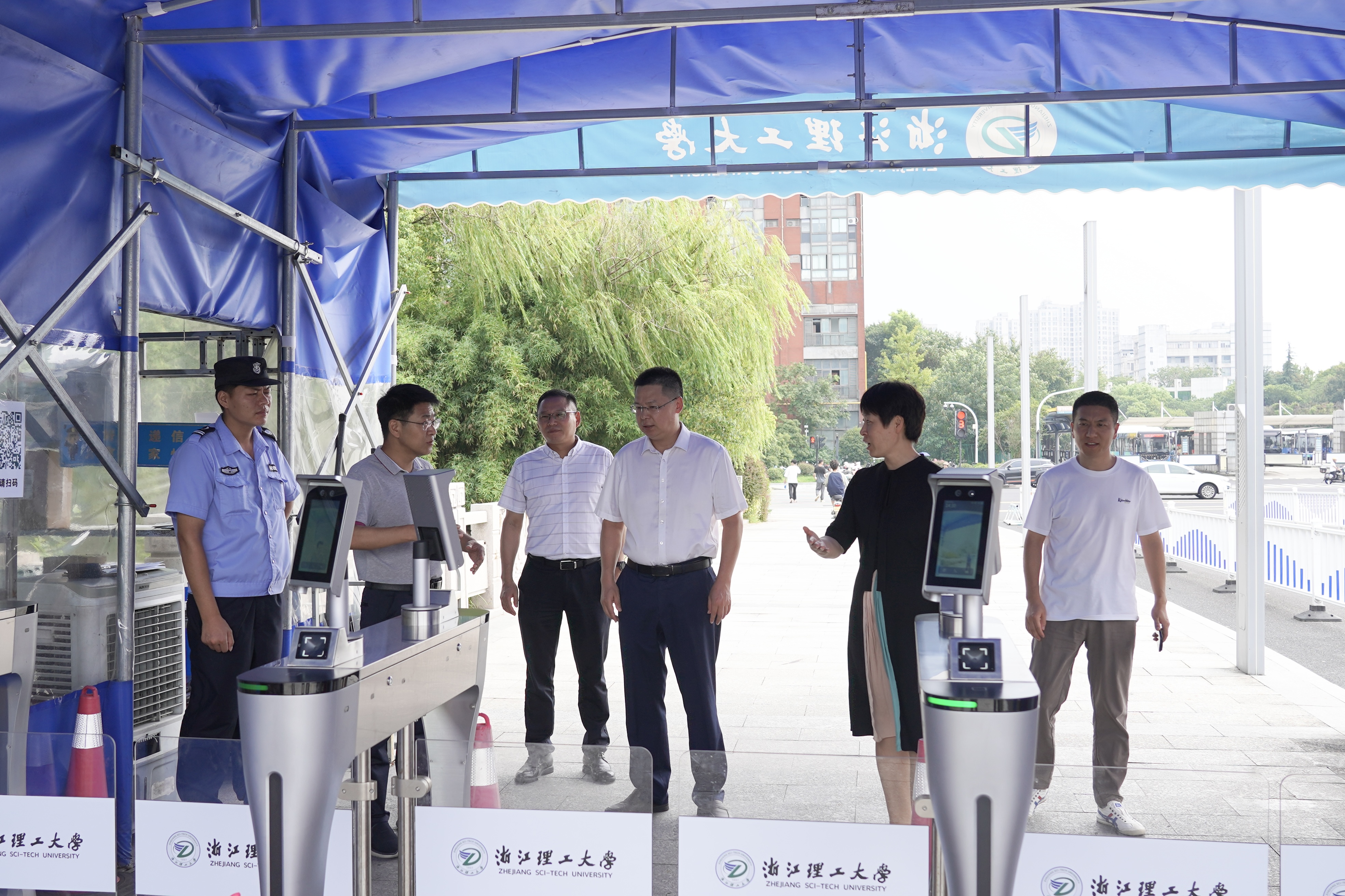 在下沙校区,赵全军一行先后来到教学区南门门岗、教学区主水泵房、2号教学楼、篮球场、紫薇阁一楼餐厅、生活二区4号南楼等场所进行走访检查,同正在为开学做准备工作的工作人员和返校学生亲切交流,详细了解基础设施提质改造、教学工作安排、校园安全管理和学生开学报到筹备工作等情况,针对发现的问题进行现场研讨并提出意见。
