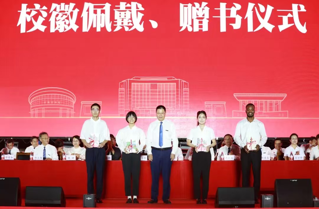 典礼在庄严的国歌声中拉开序幕。校党委书记赵全军向新生代表发放校徽并赠送《mk官方网站_mk(中国)办学史料汇编》《身边的榜样》《习近平的七年知青岁月》《习近平谈治国理政》第四卷英文版等书籍。戴上校徽意味着正式成为学校的一员,也将承担起作为学校一份子的责任和使命,书籍承载着学校百年的厚重历史,也代表着对同学们成长成才的殷殷期待。