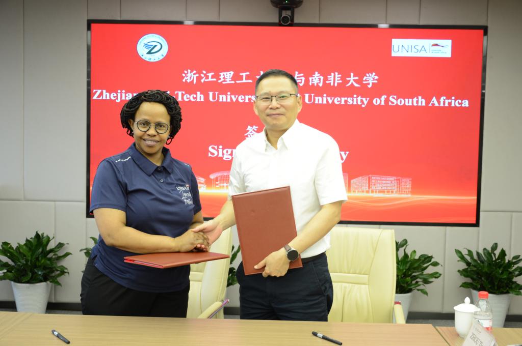随后,相关学院负责人及教师就具体学科研究情况向外宾作了介绍,双方就相关学科的学术交流和合作研究等进行了讨论。周必彧与梅伊瓦共同签署校际合作谅解备忘录,为我校与南非大学的未来合作揭开序幕。