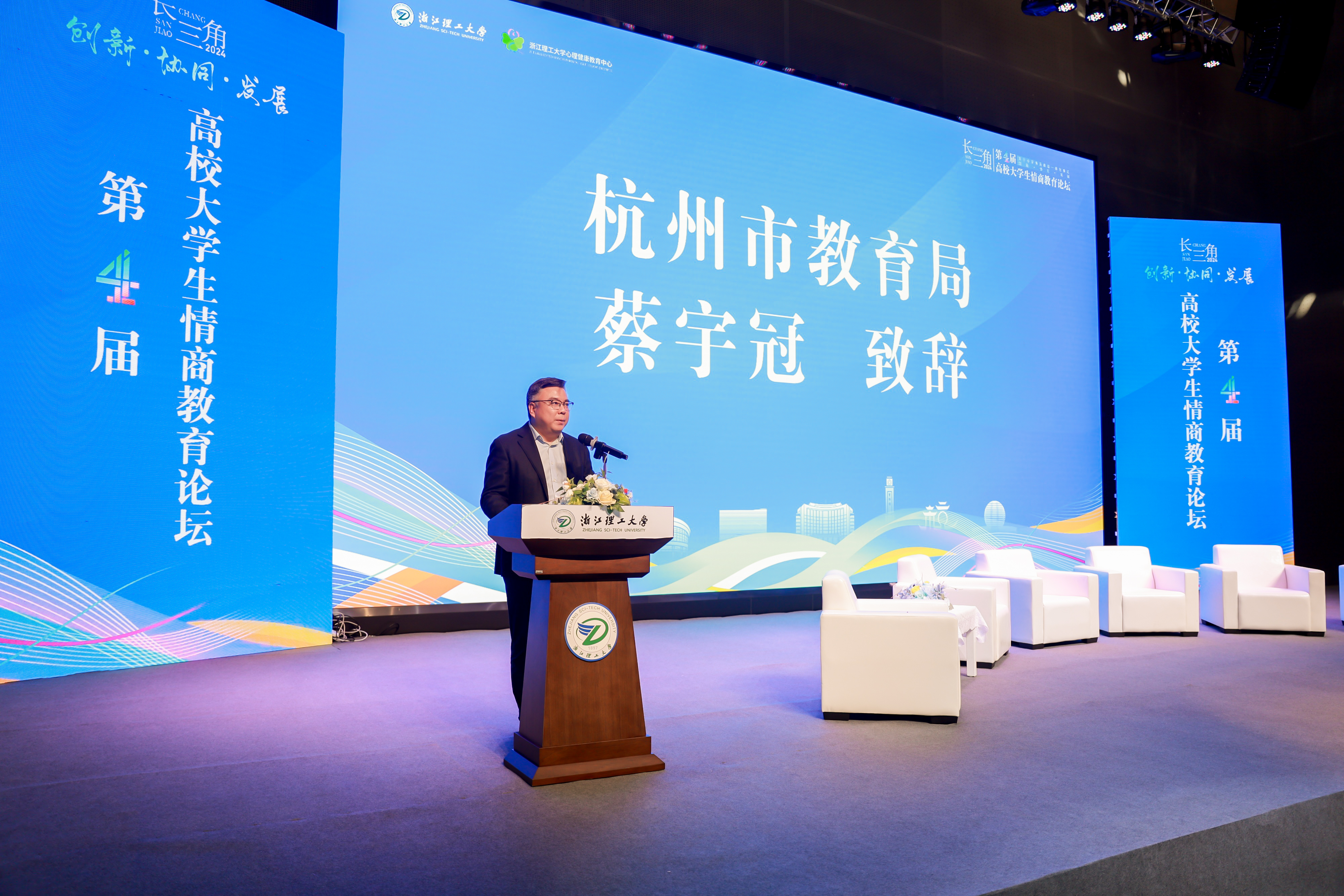 杭州市教育局高教处副处长蔡宇冠致辞。他对论坛的召开表示热烈祝贺,对各位嘉宾的到来表示热烈欢迎,并从“创新教育模式,探索学生全生命周期护航模式”“协同育人资源,构建大中小一体化情商教育体系”“共建共治共享,促进学术科研和育人实践融合发展”三个角度谈到共同推进大中小学情商教育一体化的美好愿景,希望借全国教育大会精神传学之风,实现“创新·协同·发展”之义。