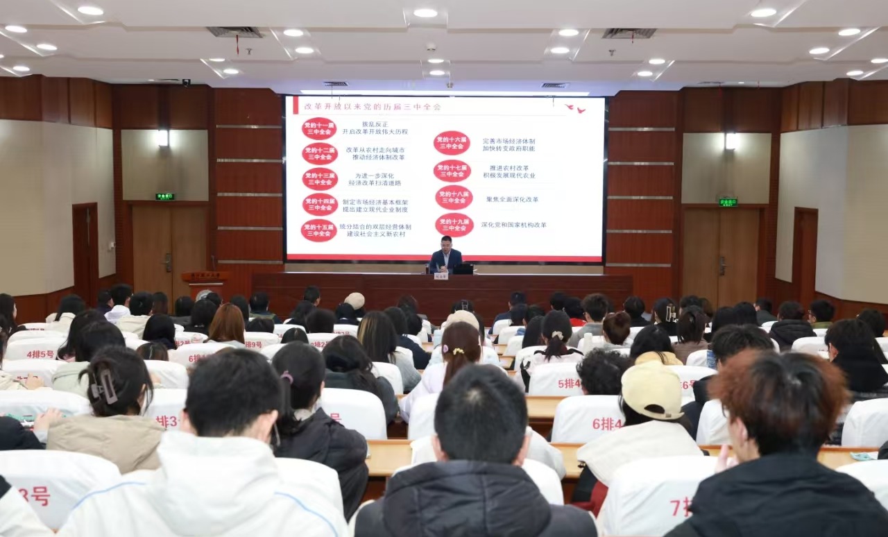 12月5日,校党委书记赵全军以“学习宣传贯彻党的二十届三中全会精神”为主题,为经济管理学院师生上了一堂生动的《形势与政策》课。他从改革开放以来党的历届三中全会作为切入点,为经济管理学院师生全面阐释了党的二十届三中全会的精神要义、高校全面深化改革的重要内容和学校贯彻落实全面深化改革的重点举措三个方面的内容。课堂旁征博引、深入浅出、案例翔实,引起在场师生强烈反响和广泛共鸣。