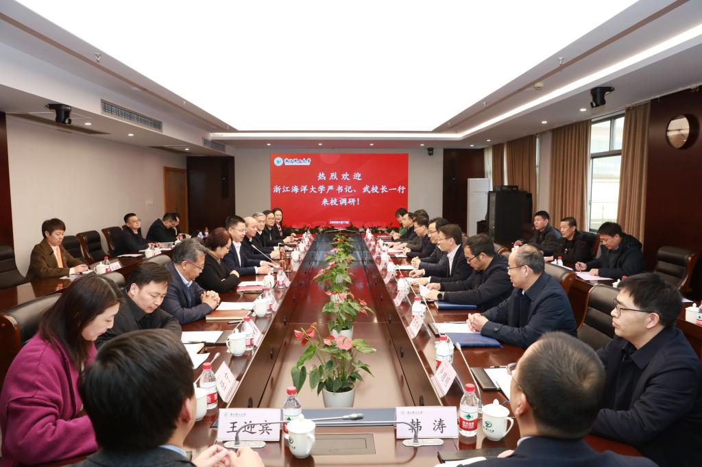 1月17日,浙江海洋大学党委书记严小军、校长武传宇一行来校调研。校党委书记赵全军陪同调研并主持座谈会,校长、中国工程院院士陈文兴出席座谈会,校党委委员、副校长姚菊明,校党委副书记缪鲁加陪同调研。浙江海洋大学党委班子成员王剑俊、陈仁军、卢金树、吴高峰、王健鑫、卢理明、林静、韩涛、王迎宾,我校党委班子成员姚珺、陈正奎、郭玉海、缪鲁加、陈爱喜、高丽静、任宁参加座谈会。