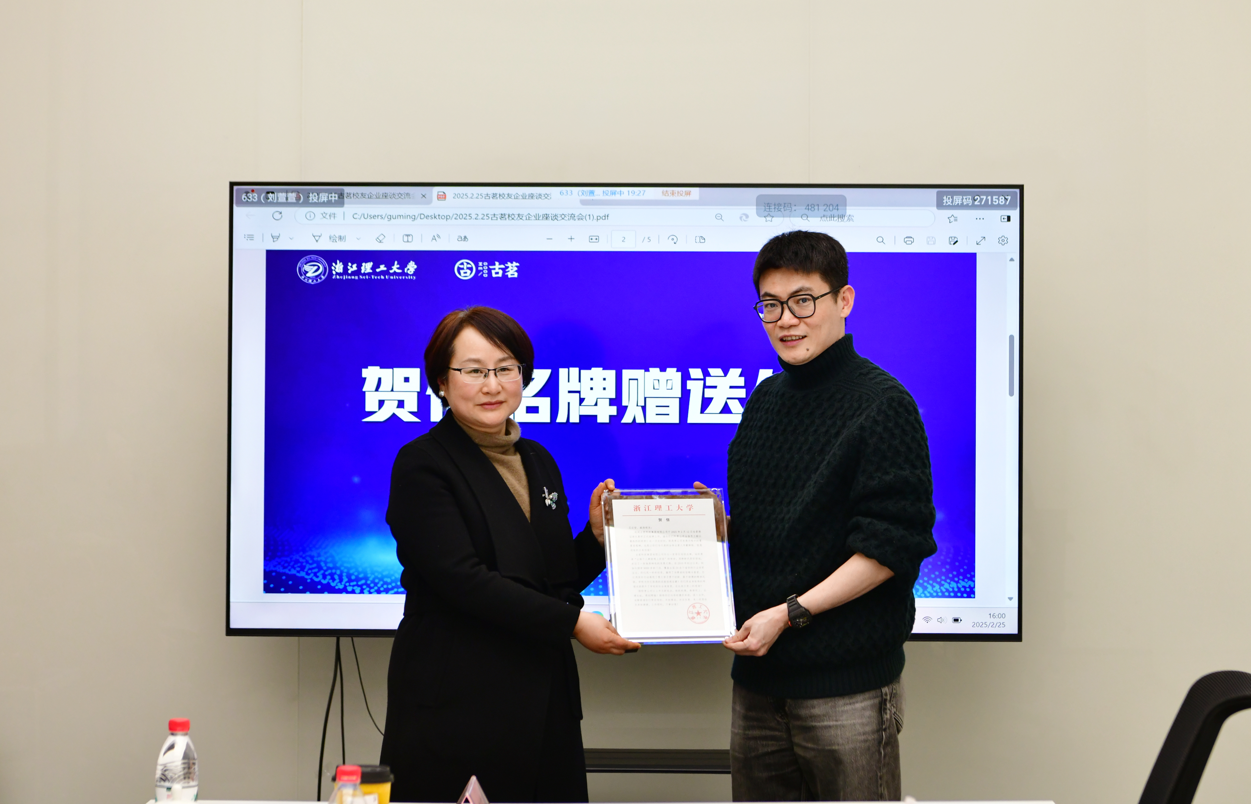 校党委副书记姚珺向校友企业古茗科技集团有限公司赠送贺信铭牌。