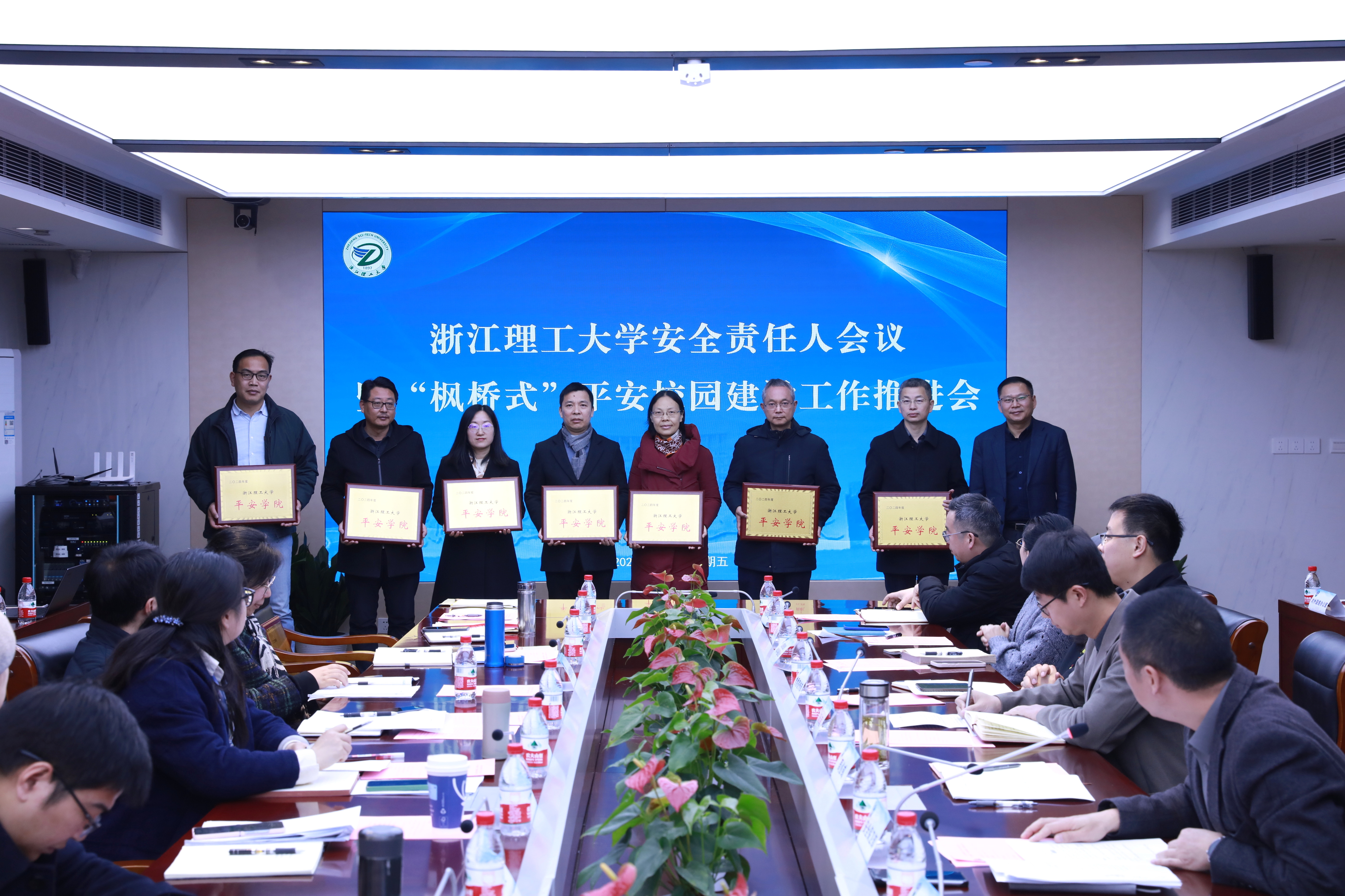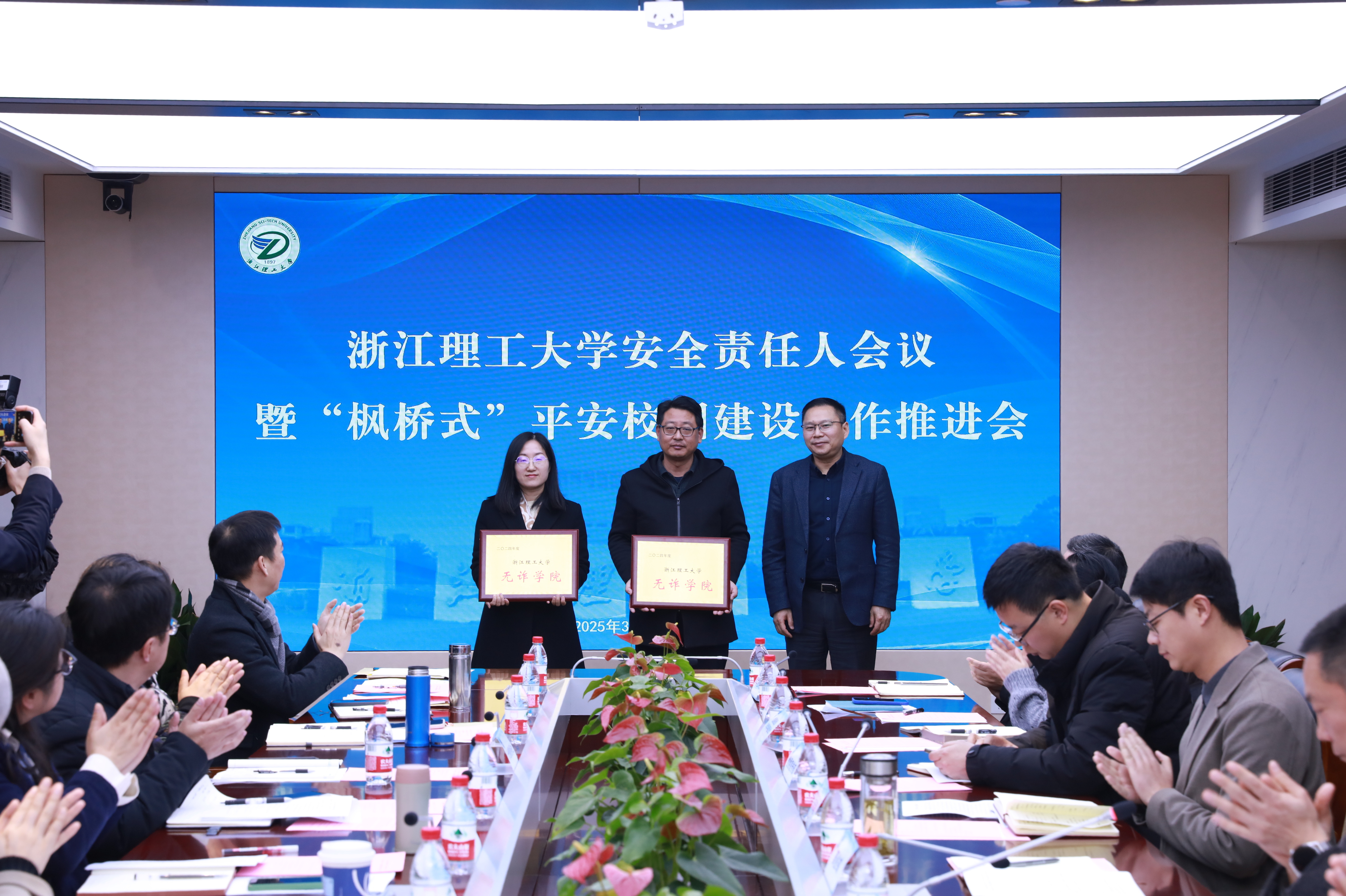 会议表彰了2024年度获得校“平安学院”和“反诈学院”荣誉称号的学院。纺织科学与工程学院(国际丝绸学院)、生命科学与医药学院与启新学院就安全稳定工作的经验做法作了交流发言。