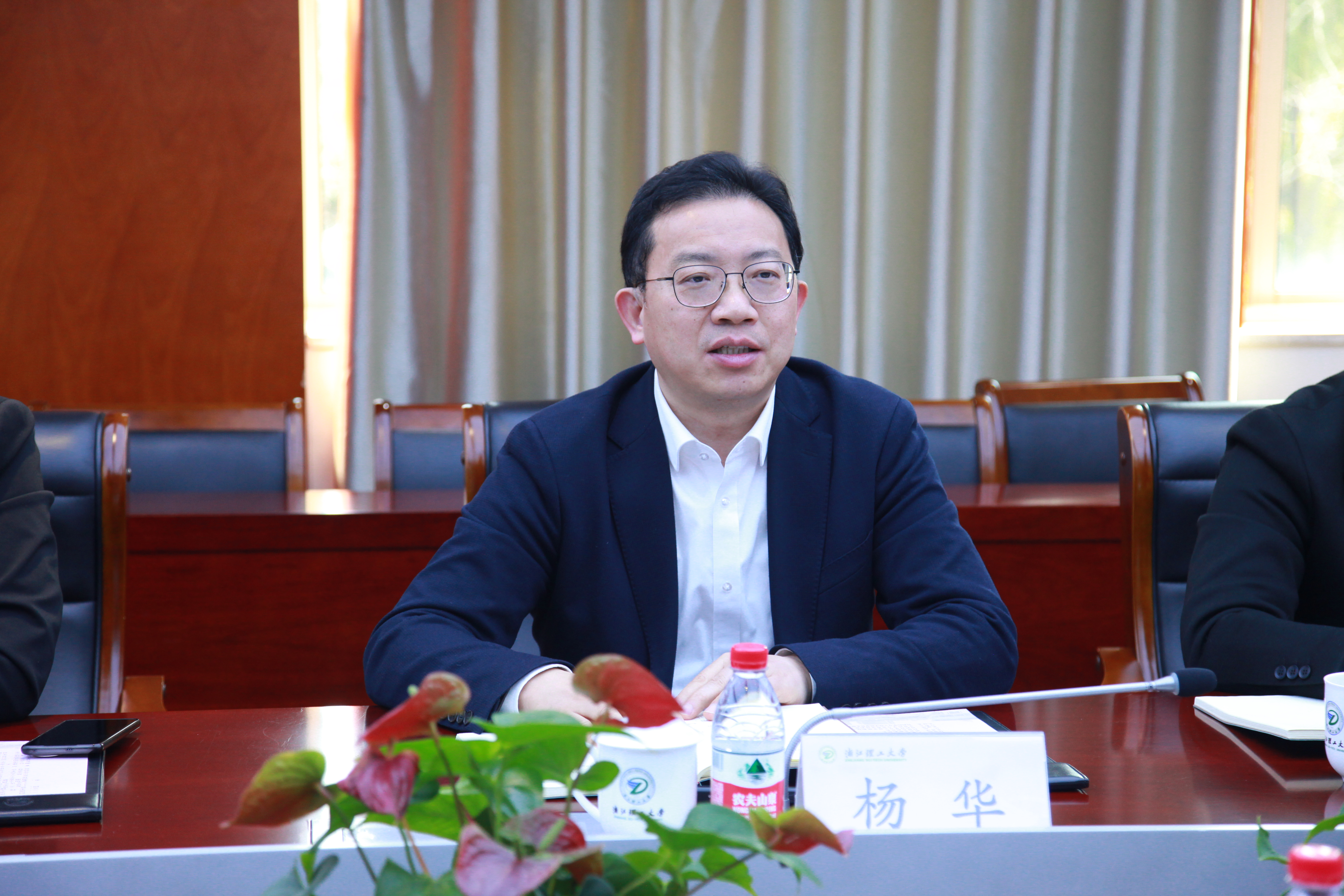 杨华高度认可学校在人才培养、科研成果及转化方面的成效,他提出三点合作期待:一是加强人才培养交流。双方开展博士后联合培养,依托浙理工博士后流动站,借助杭州市及萧山区人才政策,吸引优秀博士人才加入湘湖实验室;二是推进研究生培养基地建设。推动双方在生物技术、材料科学等领域开展研究生培养和科研项目合作,给予研究生招生指标上支持,力争建成省级研究生联合培养基地;三是强化科研项目攻关协作。邀请学校专家参与湘湖实验室重大科研项目协同攻关,探索柔性引进人才机制,推动学科交叉融合与成果转化。