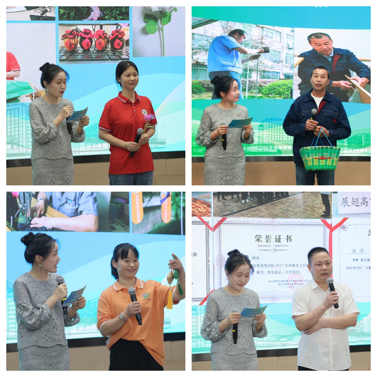 对话环节还精心设计了才艺展示,食堂大姐亲手钩织的毛线花栩栩如生,每一片花瓣都蕴含着精细和专注;保洁阿姨亲手缝制的香囊精巧别致,沁人心脾的芬芳传递着传统技艺的韵味;维修师傅利用废旧材料制作的菜篮坚固美观,变废为宝的创意彰显环保智慧。这些饱含温度的手工作品,不仅是匠心独运的生活美学表达,更无声诉说着后勤人结合特长迸发的无限创造力和对生活的无比热爱。
