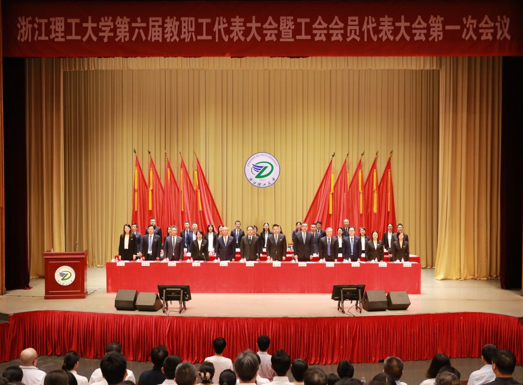 在预备会通过大会主要议题和主席团成员名单后,学校第六届教职工代表大会暨工会会员代表大会第一次会议在雄壮的国歌声中开幕。
