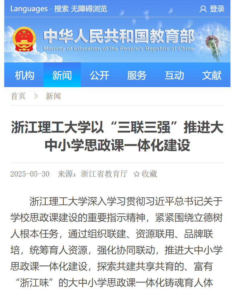 近日,教育部网站报道了我校深入学习贯彻习近平总书记关于学校思政课建设的重要指示精神,以“三联三强”推进大中小学思政课一体化建设的做法。
