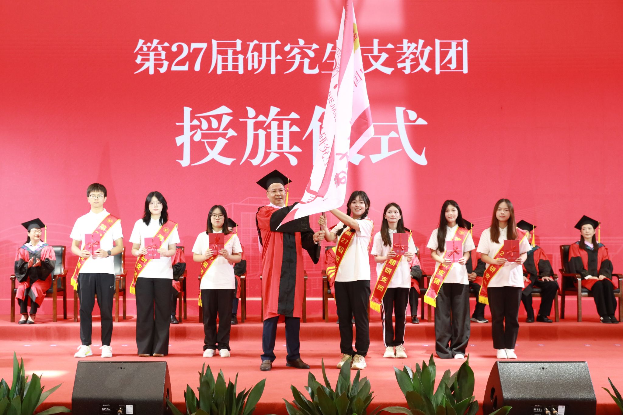 赵全军为mk官方网站_mk(中国)第27届研究生支教团授旗,并为支教团成员颁发荣誉证书。主席台就座的领导为2025届本科毕业生校友工作联络员颁发聘书和纪念礼。