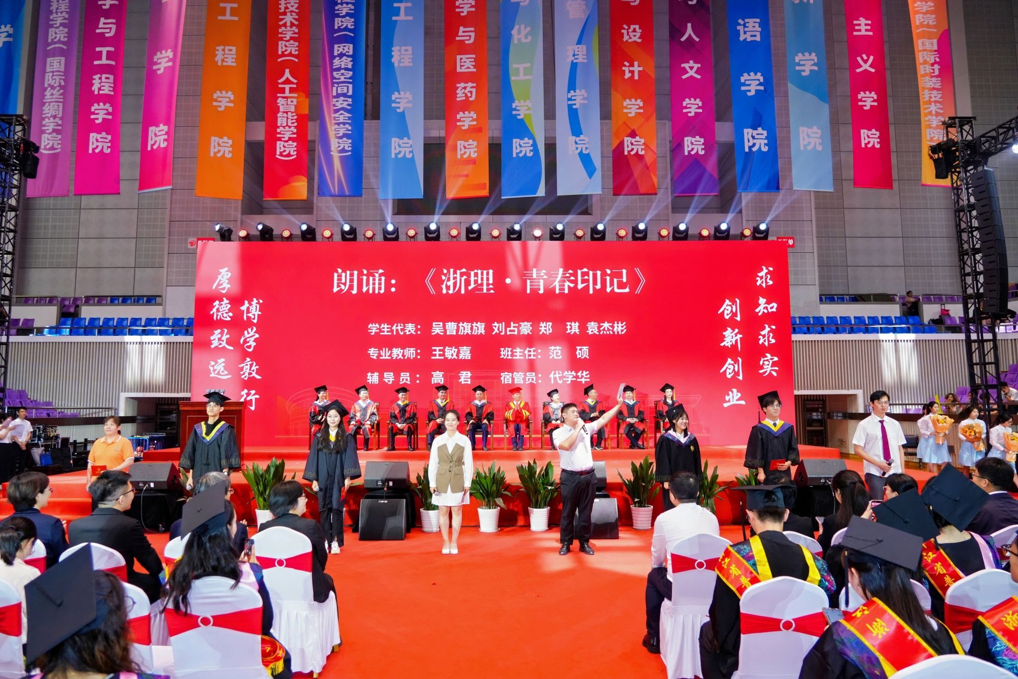典礼上,教师代表王敏嘉、班主任代表范硕、辅导员代表高君、宿管员代表代学华、毕业生代表吴曹旗旗、刘占豪、郑琪、袁杰彬深情演绎毕业主题朗诵《浙理·青春印记》。