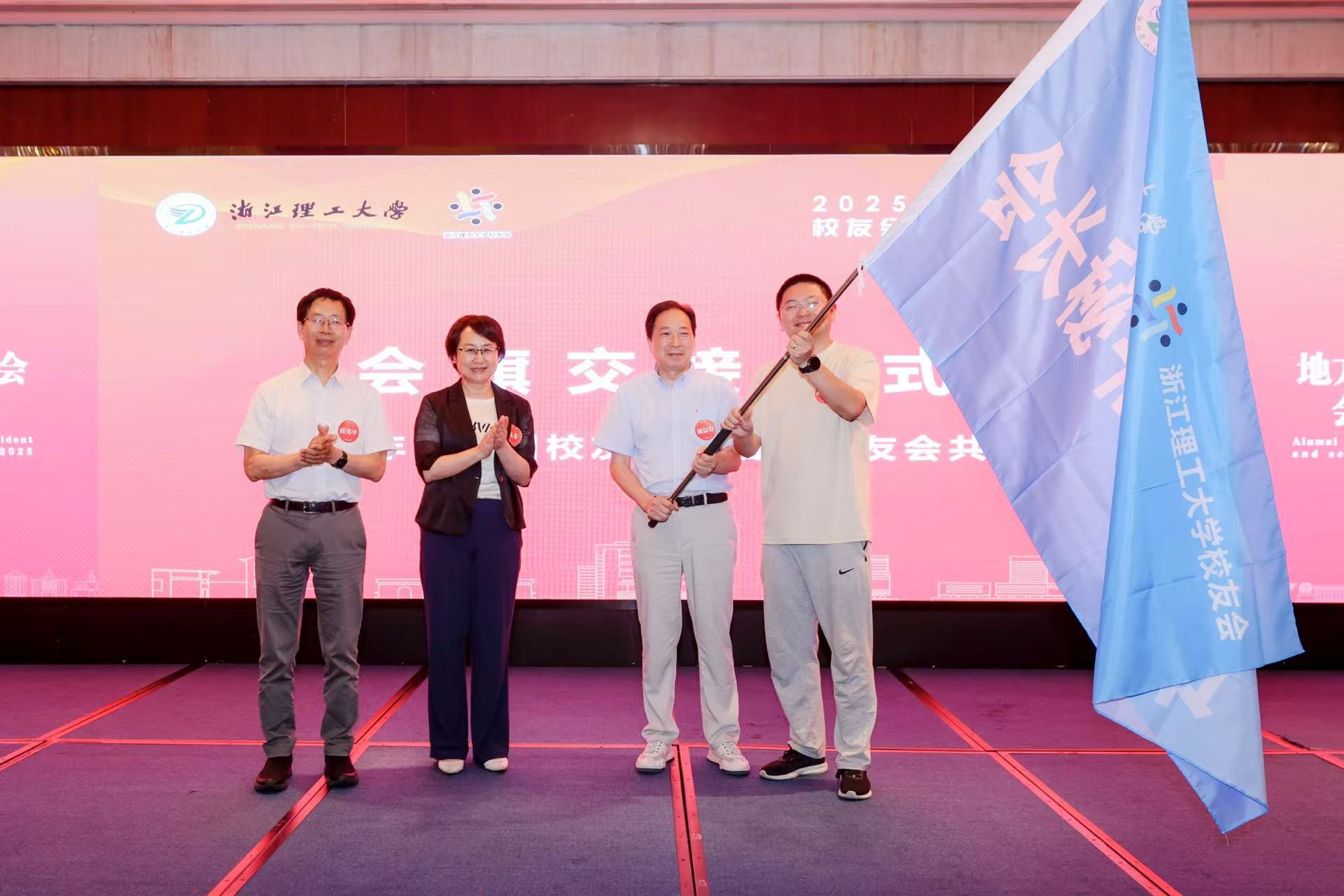 最后,会议举行了会旗交接仪式。会旗交接至下届承办单位杭州校友会和临平校友会手上。84级丝织专业校友、临平校友会会长姚益春,06级行政管理专业校友、杭州校友会常务副秘书长阮国江代表临平校友会和杭州校友会接过会旗并向大家发出了热情的邀请。