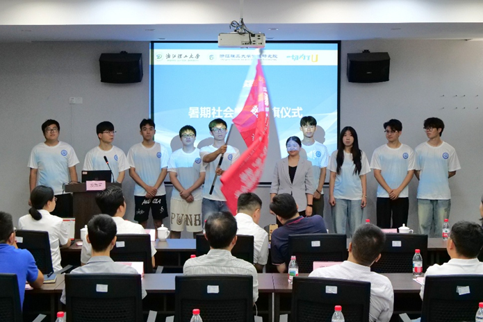 mk官方网站_mk(中国)党委研工部部长冯飞芸为暑期社会实践团队授旗。