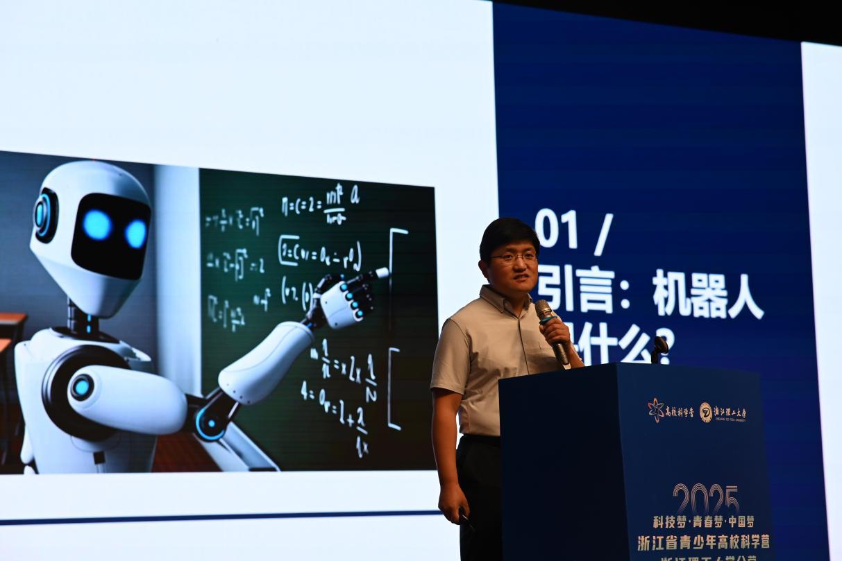 在科技名师大讲堂上,机械工程学院陈刚教授为营员们带来题为《从蹒跚学步到击水弄潮:机器人发展与思考》的报告分享。他以“机器人是什么”引入,向同学们介绍了机器人的概念,以及四足机器人、人形机器人、水下机器人的发展史、发展历程、应用场景等。