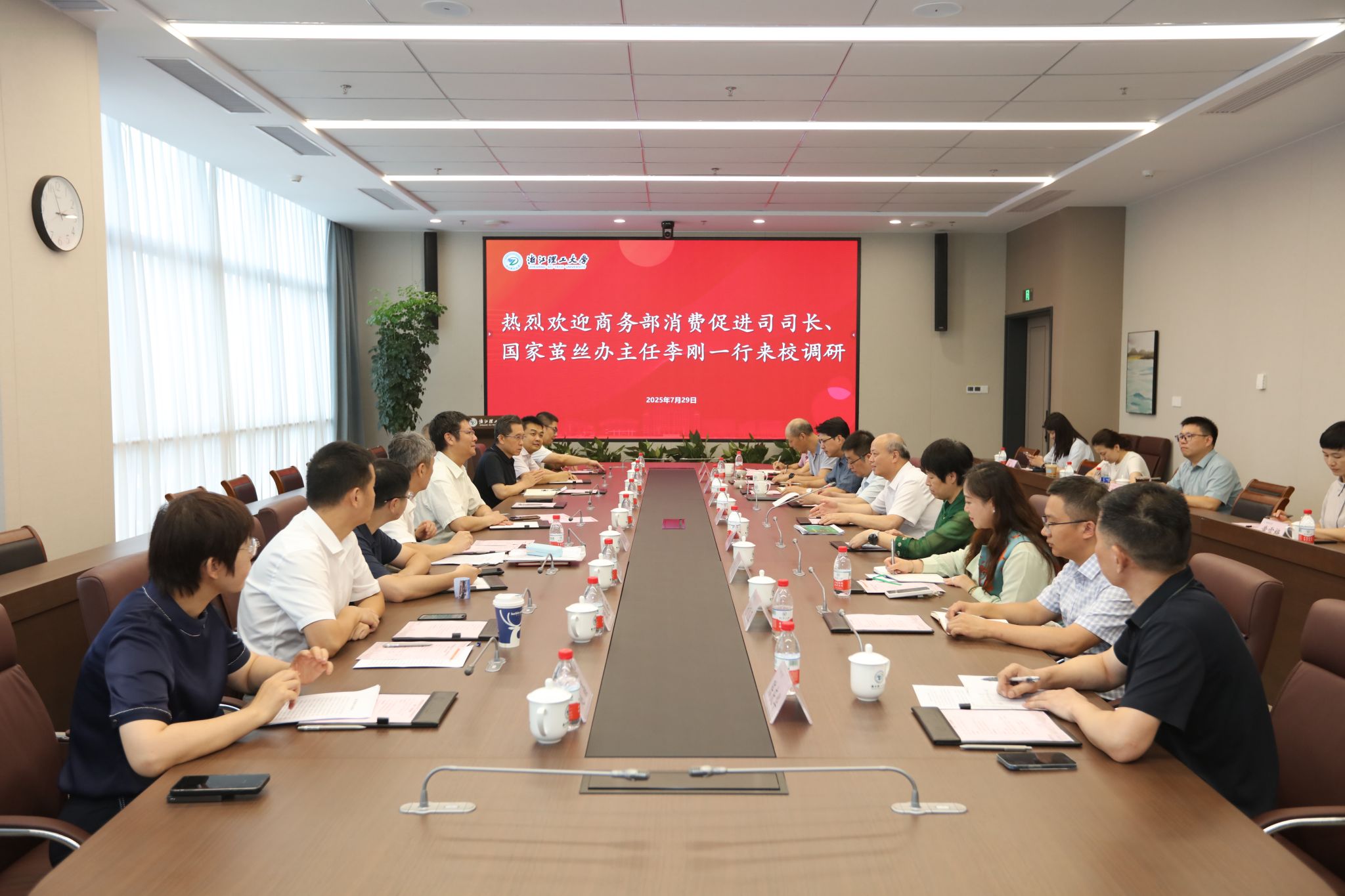 7月29日下午,商务部消费促进司司长、国家茧丝办主任李刚一行来我校进行调研。中国丝绸协会会长唐琳,省经信厅总工程师李永伟,省商务厅党组成员、副厅长吾布力喀斯木·买吐送,杭州市经信局二级巡视员杨荣欣等参加调研。校长陈文兴陪同调研并出席座谈会。