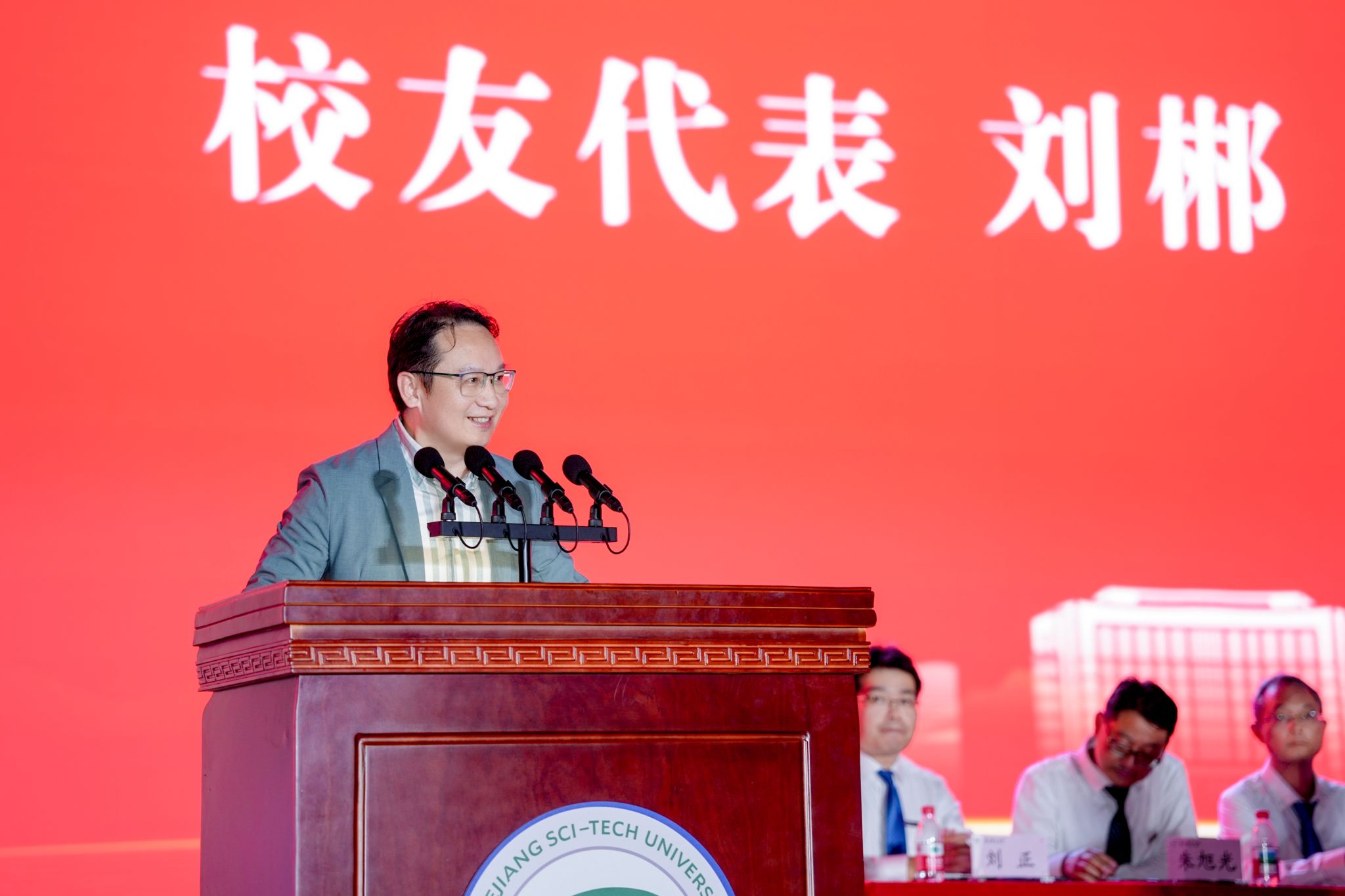89级染整专业校友、浙江凌迪数字科技有限公司创始人兼CEO刘郴作为校友代表发言。他分享了自己从染整工程到计算机科学、从传统纺织到数字科技的跨界创业历程,并寄语新生“终身学习、跨界融合、深耕细作”。演讲中,他与凌迪科技打造的虚拟数字人同台亮相,以科技之力穿越时空,展现浙理人的创新基因。