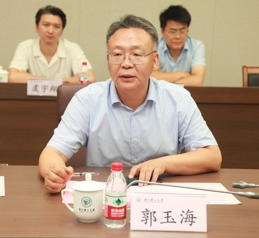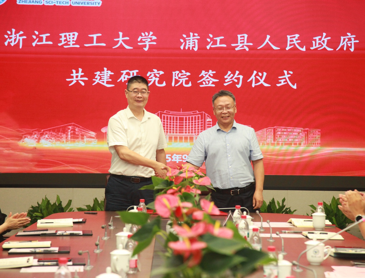 郭玉海代表学校对浦江县领导的到来表示热烈欢迎及衷心感谢。他简要介绍了近年来学校科技工作发展情况,指出此次共建签约是双方深化合作、共谋发展的重要里程碑,是学校主动融入和服务地方发展大局的关键举措。他分享了学校产学研融合经验,特别介绍了省现代纺织技术创新中心“四题一评”(企业出题、平台答题、车间验题、市场评价)成功模式,表示学校将全力支持研究院建设,为浦江县产业转型升级提供强有力的科技和人才支撑。
