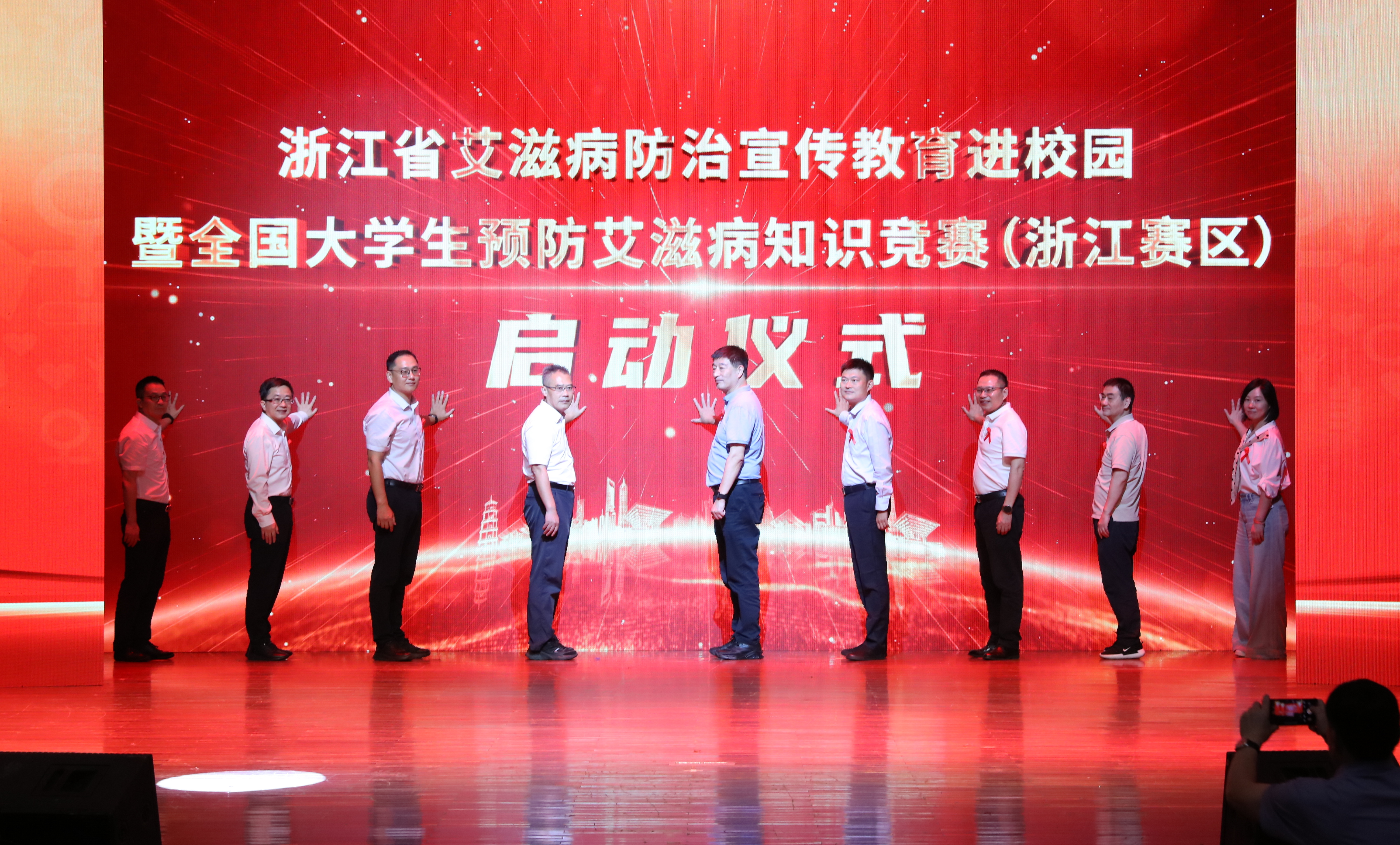 本次活动的指导单位、主办单位、协办单位的领导上台共同开启我省“艾滋病防治宣传教育进校园暨全国大学生预防艾滋病知识竞赛(浙江赛区)活动”。