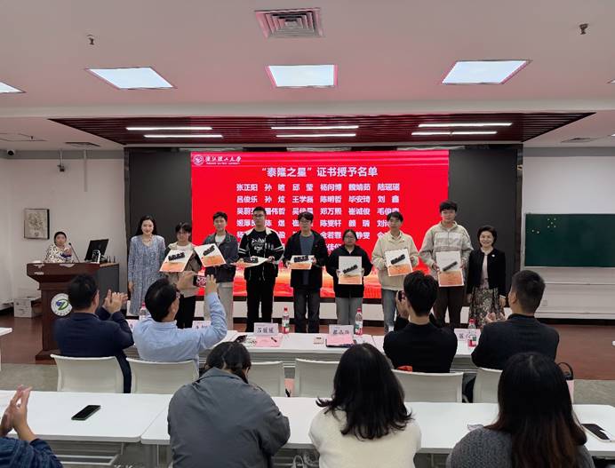 会上,“森帛”奖助学金获奖名单公布,翟兴甫为获奖同学颁发荣誉证书。蔡函孜、吕媛媛为“泰隆之星”国际交流成长基金项目获奖同学颁发“泰隆之星”证书。