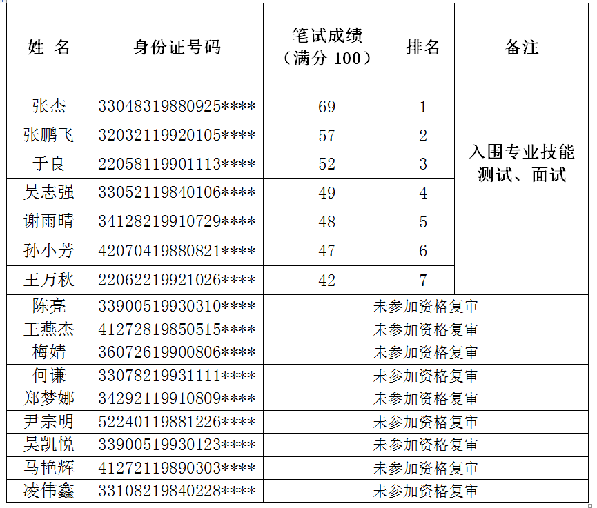 考试人员名单根据招聘岗位应聘人员笔试成绩由高到低排列,入围专业技能测试与面试人员名单由高分到低分按1:5比例确定。
