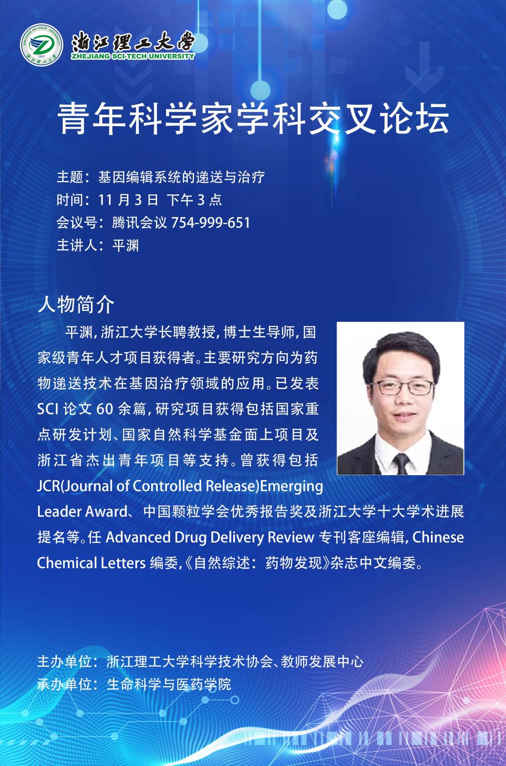 主讲人简介:平渊,浙江大学长聘教授,博士生导师,国家级青年人才项目获得者。主要研究方向为药物递送技术在基因治疗领域的应用。已发表SCI论文60余篇,研究项目获得包括国家重点研发计划、国家自然科学基金面上项目及浙江省杰出青年项目等支持。曾获得包括JCR(Journal of Controlled Release)Emerging Leader Award、中国颗粒学会优秀报告奖及浙江大学十大学术进展提名等。任Advanced Drug Delivery Review专刊客座编辑,Chinese Chemical Letters编委,《自然综述:药物发现》杂志中文编委。