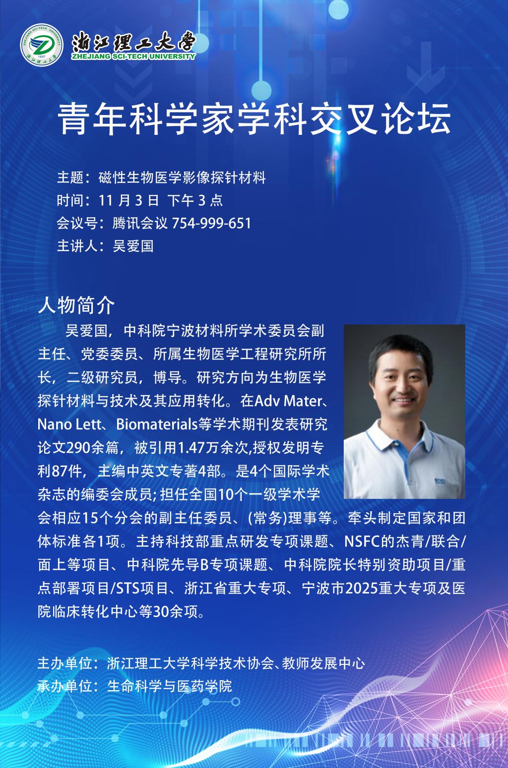 主讲人简介:吴爱国,中科院宁波材料所学术委员会副主任、党委委员、所属生物医学工程研究所所长,二级研究员,博导。研究方向为生物医学探针材料与技术及其应用转化。在Adv Mater、Nano Lett、Biomaterials等学术期刊发表研究论文290余篇,被引用1.47万余次,授权发明专利87件,主编中英文专著4部。是4个国际学术杂志的编委会成员;担任全国10个一级学术学会相应15个分会的副主任委员、(常务)理事等。牵头制定国家和团体标准各1项。主持科技部重点研发专项课题、NSFC的杰青/联合/面上等项目、中科院先导B专项课题、中科院院长特别资助项目/重点部署项目/STS项目、浙江省重大专项、宁波市2025重大专项及医院临床转化中心等30余项。