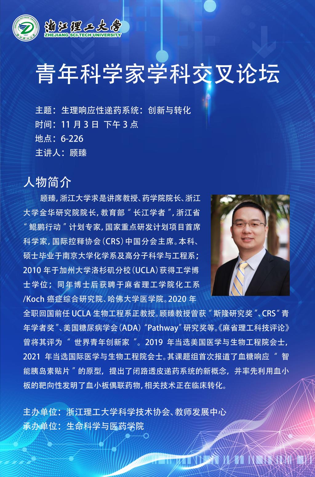 主讲人简介:顾臻,浙江大学求是讲席教授、药学院院长、浙江大学金华研究院院长,教育部“长江学者”,浙江省“鲲鹏行动”计划专家,国家重点研发计划项目首席科学家,国际控释协会(CRS)中国分会主席。本科、硕士毕业于南京大学化学系及高分子科学与工程系;2010年于加州大学洛杉矶分校(UCLA)获得工学博士学位;同年博士后获聘于麻省理工学院化工系/Koch癌症综合研究院、哈佛大学医学院。2020年全职回国前任UCLA生物工程系正教授。顾臻教授曾获“斯隆研究奖”、CRS“青年学者奖”、美国糖尿病学会(ADA)“Pathway”研究奖等。《麻省理工科技评论》曾将其评为“世界青年创新家”。2019年当选美国医学与生物工程院会士,2021年当选国际医学与生物工程院会士。其课题组首次报道了血糖响应“智能胰岛素贴片”的原型,提出了闭路透皮递药系统的新概念,并率先利用血小板的靶向性发明了血小板偶联药物,相关技术正在临床转化。