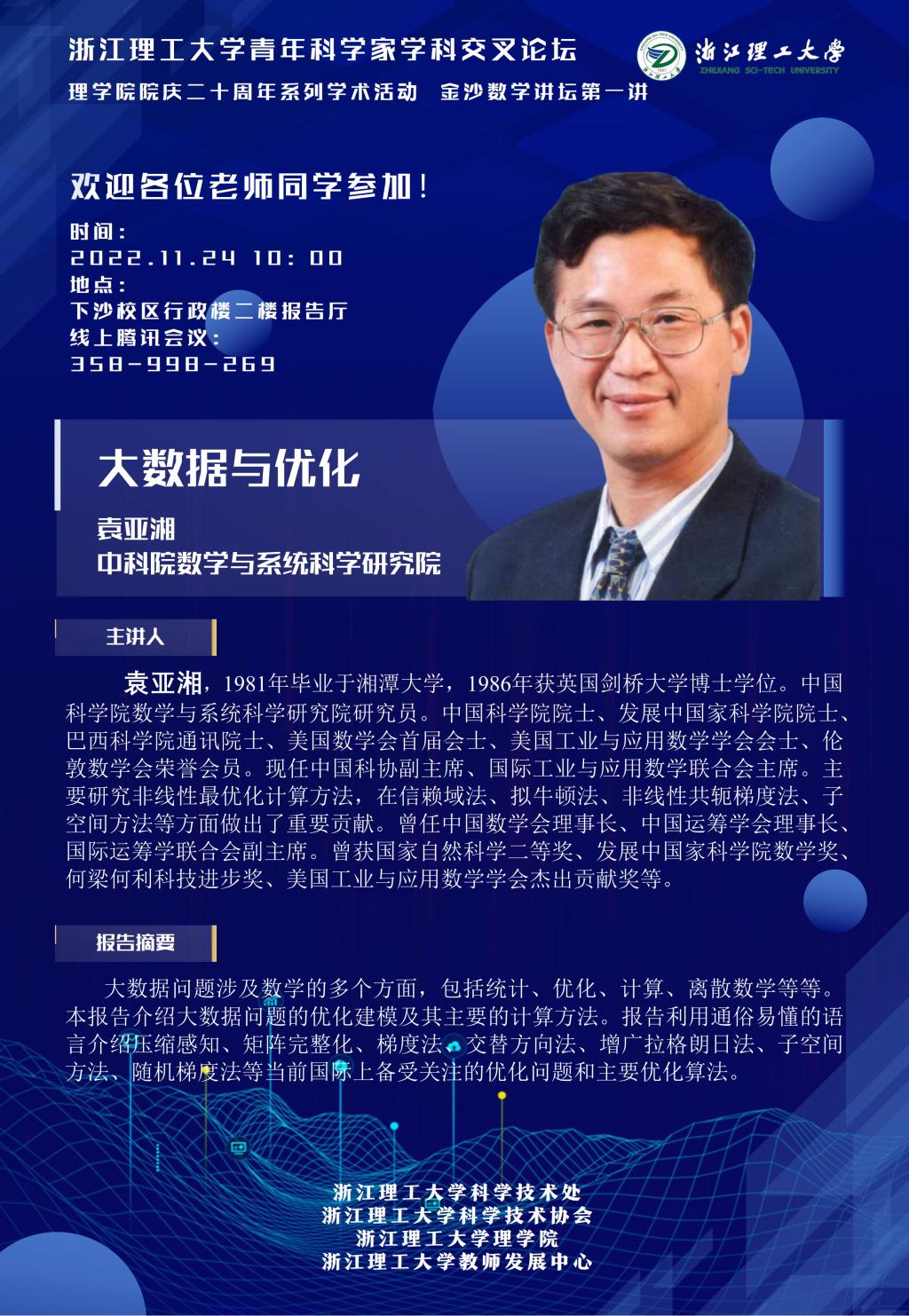 袁亚湘 , 1981年毕业于湘潭大学,1986年获英国剑桥大学博士学位。中国科学院数学与系统科学研究院研究员。中国科学院院士、发展中国家科学院院士、巴西科学院通讯院士、美国数学会首届会士、美国工业与应用数学学会会士、伦敦数学会荣誉会员。现任中国科协副主席、国际工业与应用数学联合会主席。主要研究非线性最优化计算方法,在信赖域法、拟牛顿法、非线性共轭梯度法、子空间方法等方面做出了重要贡献。曾任中国数学会理事长、中国运筹学会理事长、国际运筹学联合会副主席。曾获国家自然科学二等奖、发展中国家科学院数学奖、何梁何利科技进步奖、美国工业与应用数学学会杰出贡献奖等。