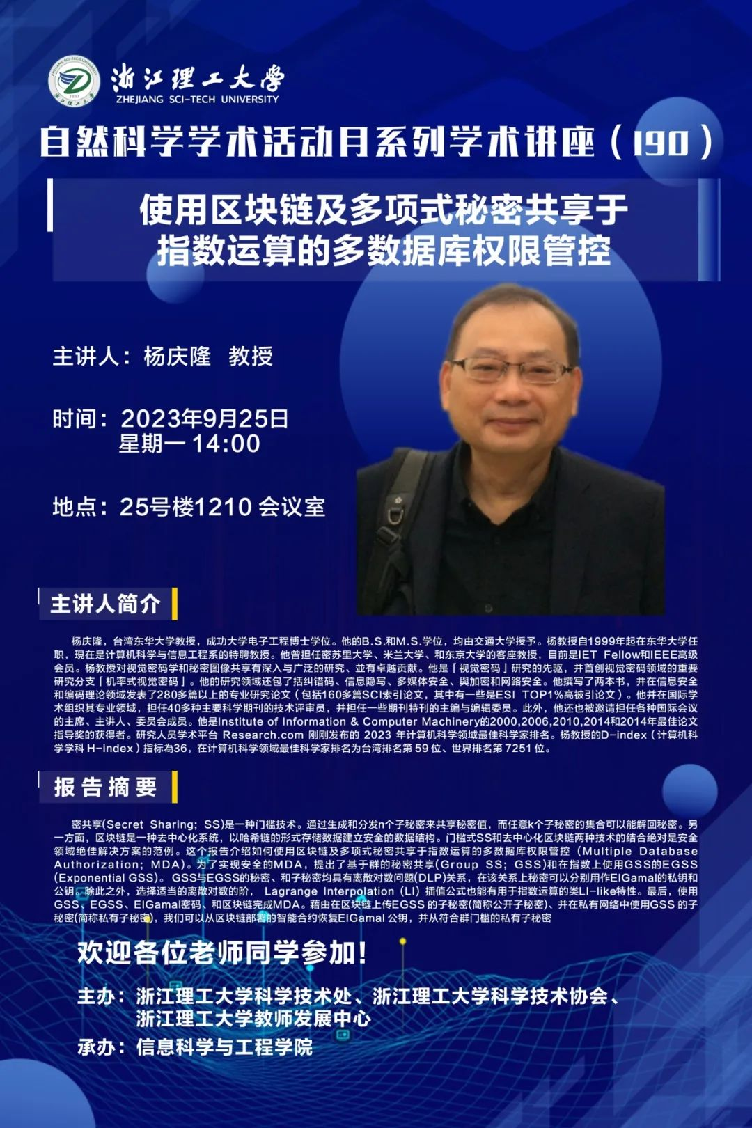 杨庆隆,台湾东华大学教授,成功大学电子工程博士学位。他的B.S.和M.S.学位,均由交通大学授予。杨教授自1999年起在东华大学任职,現在是计算机科学与信息工程系的特聘教授。他曾担任密苏里大学、米兰大学、和东京大学的客座教授,目前是IET Fellow和IEEE高级会员。杨教授对视觉密码学和秘密图像共享有深入与广泛的研究、並有卓越贡献。他是「视觉密码」研究的先驱,并首创视觉密码领域的重要研究分支「机率式视觉密码」。他的研究领域还包了括纠错码、信息隐写、多媒体安全、與加密和网路安全。他撰写了两本书,并在信息安全和编码理论领域发表了280多篇以上的专业研究论文(包括160多篇SCI索引论文,其中有一些是ESI TOP1%高被引论文)。他并在国际学术组织其专业领域,担任40多种主要科学期刊的技术评审员,并担任一些期刊特刊的主编与编辑委员。此外,他还也被邀请担任各种国际会议的主席、主讲人、委员会成员。他是Institute of Information & Computer Machinery的2000,2006,2010,2014和2014年最佳论文指导奖的获得者。研究人员学术平台 Research.com 刚刚发布的 2023 年计算机科学领域最佳科学家排名。杨教授的D-index(计算机科学学科 H-index)指标為36,在计算机科学领域最佳科学家排名为台湾排名第 59 位、世界排名第 7251 位。