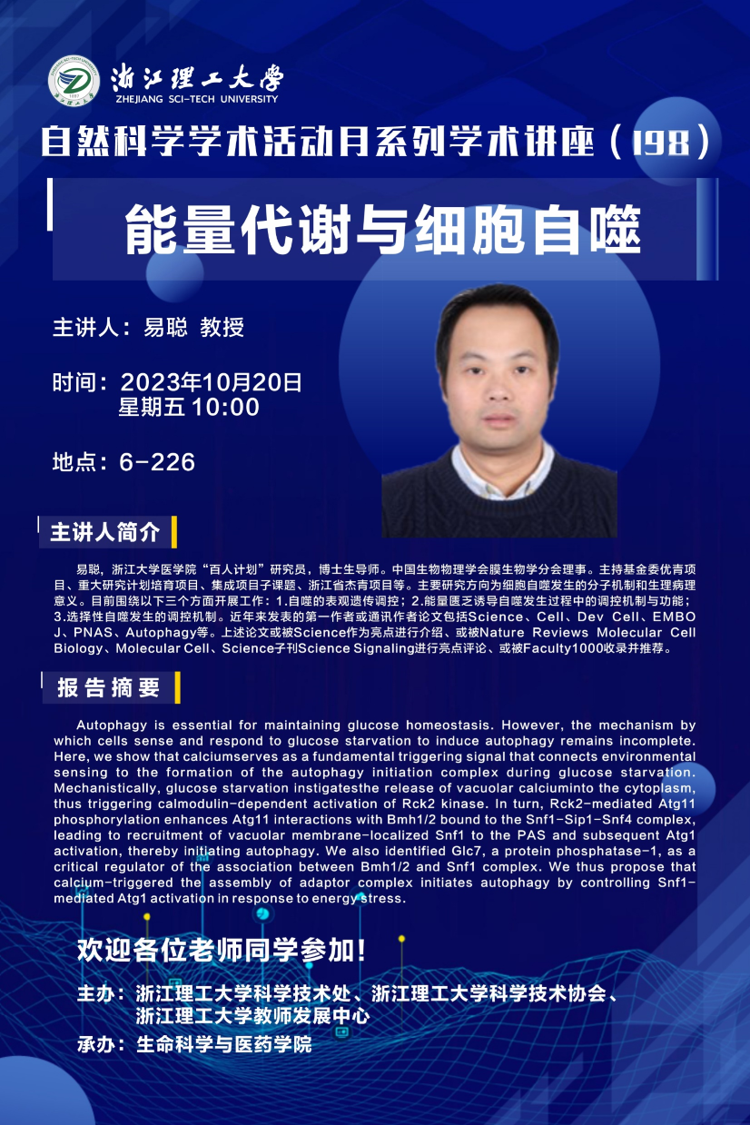 易聪, 浙江大学医学院“百人计划”研究员,博士生导师。中国生物物理学会膜生物学分会理事。主持基金委优青项目、重大研究计划培育项目、集成项目子课题、浙江省杰青项目等。主要研究方向为细胞自噬发生的分子机制和生理病理意义。目前围绕以下三个方面开展工作:1.自噬的表观遗传调控;2.能量匮乏诱导自噬发生过程中的调控机制与功能;3.选择性自噬发生的调控机制。近年来发表的第一作者或通讯作者论文包括Science、Cell、Dev Cell、EMBO J、PNAS、Autophagy等。上述论文或被Science作为亮点进行介绍、或被Nature Reviews Molecular Cell Biology、Molecular Cell、Science子刊Science Signaling进行亮点评论、或被Faculty1000收录并推荐。