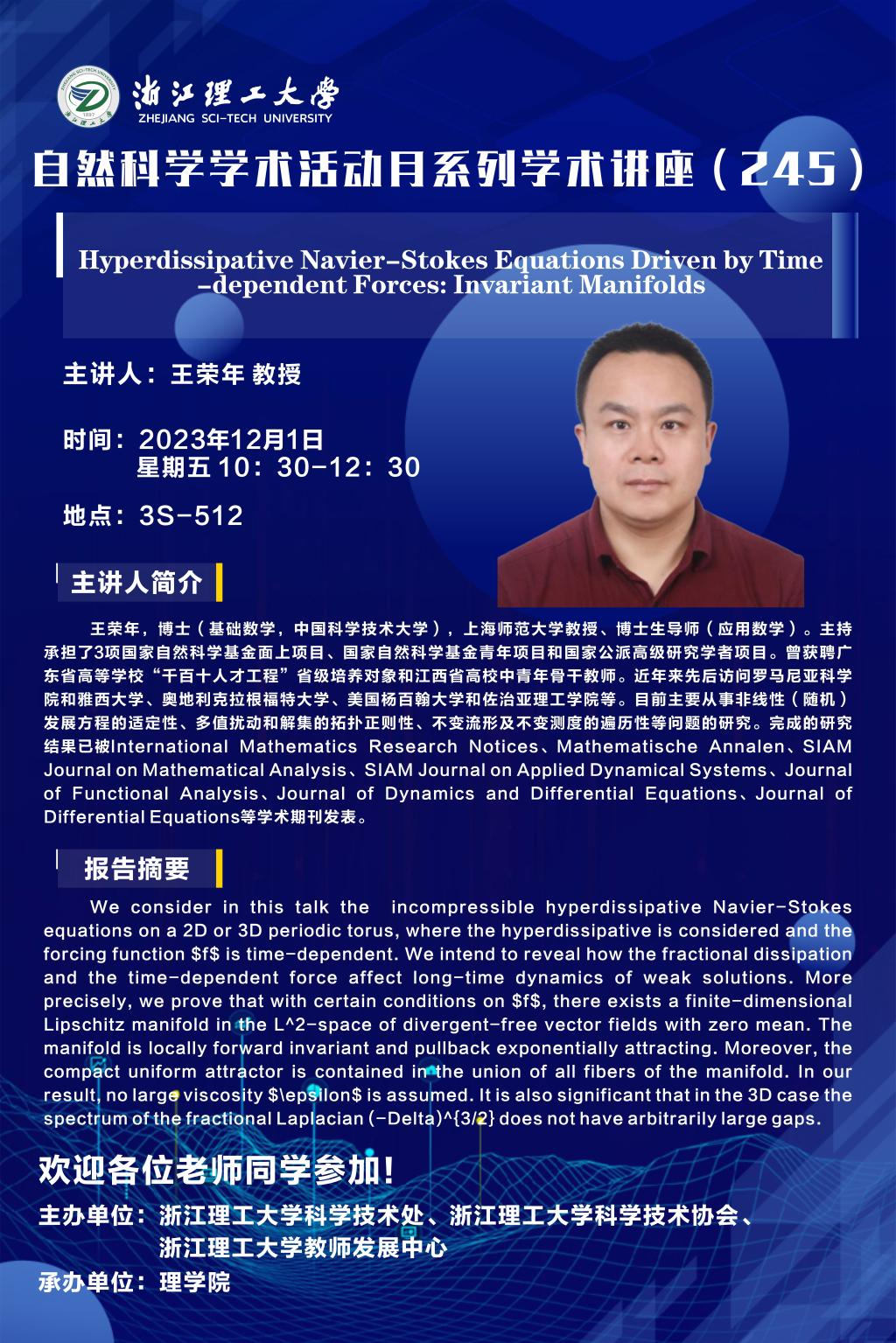 王荣年,博士(基础数学,中国科学技术大学),上海师范大学教授、博士生导师(应用数学)。主持承担了3项国家自然科学基金面上项目、国家自然科学基金青年项目和国家公派高级研究学者项目。曾获聘广东省高等学校“千百十人才工程”省级培养对象和江西省高校中青年骨干教师。近年来先后访问罗马尼亚科学院和雅西大学、奥地利克拉根福特大学、美国杨百翰大学和佐治亚理工学院等。目前主要从事非线性(随机)发展方程的适定性、多值扰动和解集的拓扑正则性、不变流形及不变测度的遍历性等问题的研究。完成的研究结果已被International Mathematics Research Notices、Mathematische Annalen、SIAM Journal on Mathematical Analysis、SIAM Journal on Applied Dynamical Systems、Journal of Functional Analysis、Journal of Dynamics and Differential Equations、Journal of Differential Equations等学术期刊发表。