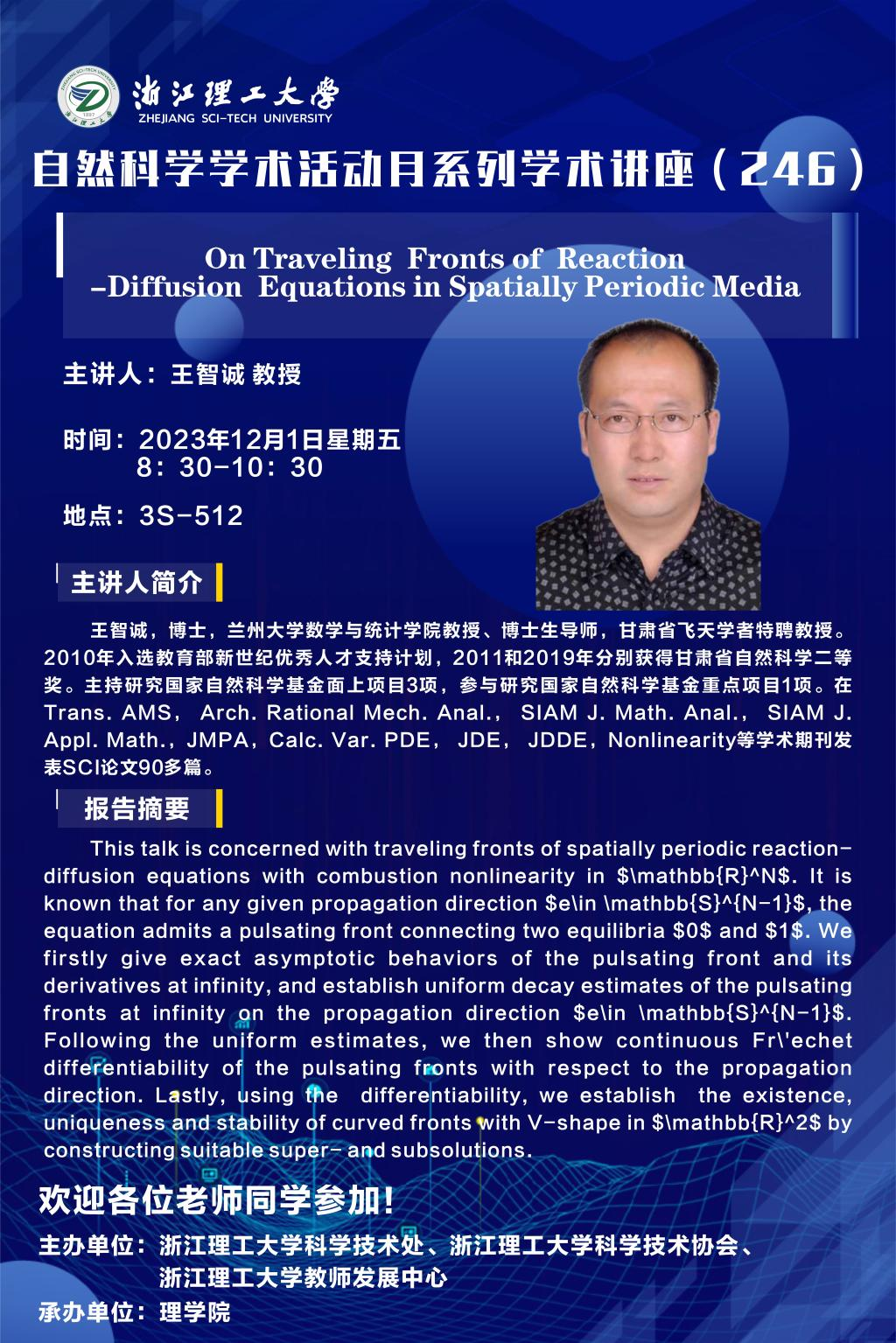 王智诚,博士,兰州大学数学与统计学院教授、博士生导师,甘肃省飞天学者特聘教授。 2010年入选教育部新世纪优秀人才支持计划,2011和2019年分别获得甘肃省自然科学二等奖。主持研究国家自然科学基金面上项目3项,参与研究国家自然科学基金重点项目1项。在Trans. AMS, Arch. Rational Mech. Anal., SIAM J. Math. Anal., SIAM J. Appl. Math.,JMPA,Calc. Var. PDE, JDE, JDDE,Nonlinearity等学术期刊发表SCI论文90多篇。