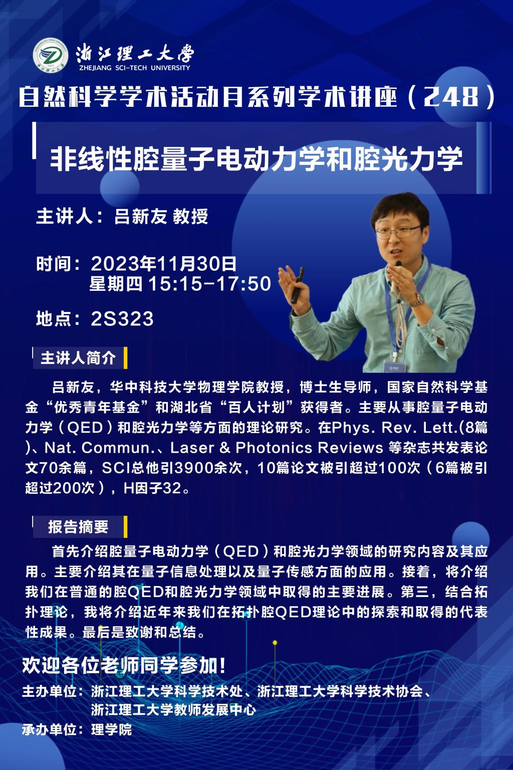 吕新友,华中科技大学物理学院教授,博士生导师,国家自然科学基金“优秀青年基金”和湖北省“百人计划”获得者。主要从事腔量子电动力学(QED)和腔光力学等方面的理论研究。在Phys. Rev. Lett.(8篇)、Nat. Commun.、Laser & Photonics Reviews 等杂志共发表论文70余篇,SCI总他引3900余次,10篇论文被引超过100次(6篇被引超过200次),H因子32。