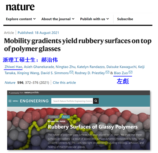 我校左彪教授于2021年以通讯作者在Nature正刊发表论文。这项研究发展了表征高分子材料表面分子运动的新方法,发现高分子塑料表面处于橡胶态,揭示了其内在分子机制,实现了微观层面对高分子材料界面现象的新认识。