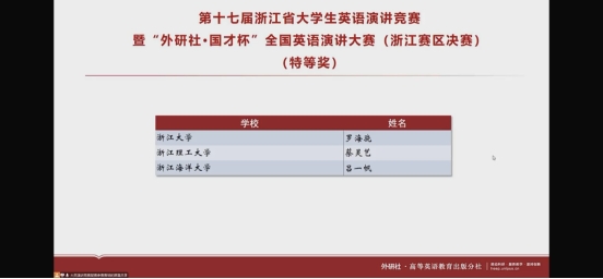 本次比赛由宁波大学承办,因疫情原因临时改为线上竞赛。我校校赛选拔出的四名选手同全省各高校选送的171名选手同台竞技,表现出色,英语专业学生蔡灵艺凭借扎实的语言功底、开阔的国际视野及从容不迫的应变能力,名列全省第二名,获省特等奖(指导老师:吴蓓蓓),直接晋级全国总决赛;严鑫获得一等奖,朱舒瑶、许恩泽荣获二等奖(指导老师:汪秀梅)。