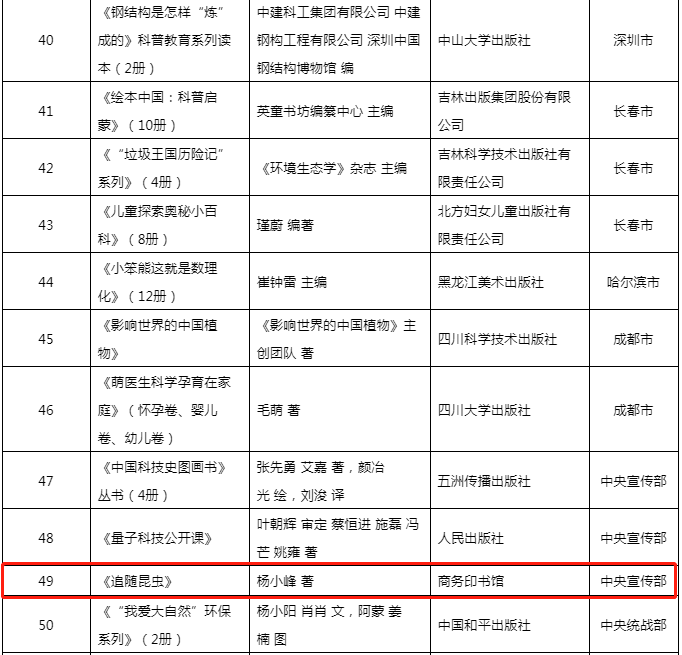 近日,2022年全国优秀科普作品推荐名单公布。我校建筑工程学院杨小峰老师的专著《追随昆虫》由中央宣传部推荐并光荣入选2022年全国优秀科普作品奖。该奖项由各省部级(含副省级)单位推选优秀科普图书作品,全国总共推选484部,由科技部成立的评议专家组选出100部,确定为2022年全国优秀科普作品并向社会推介。