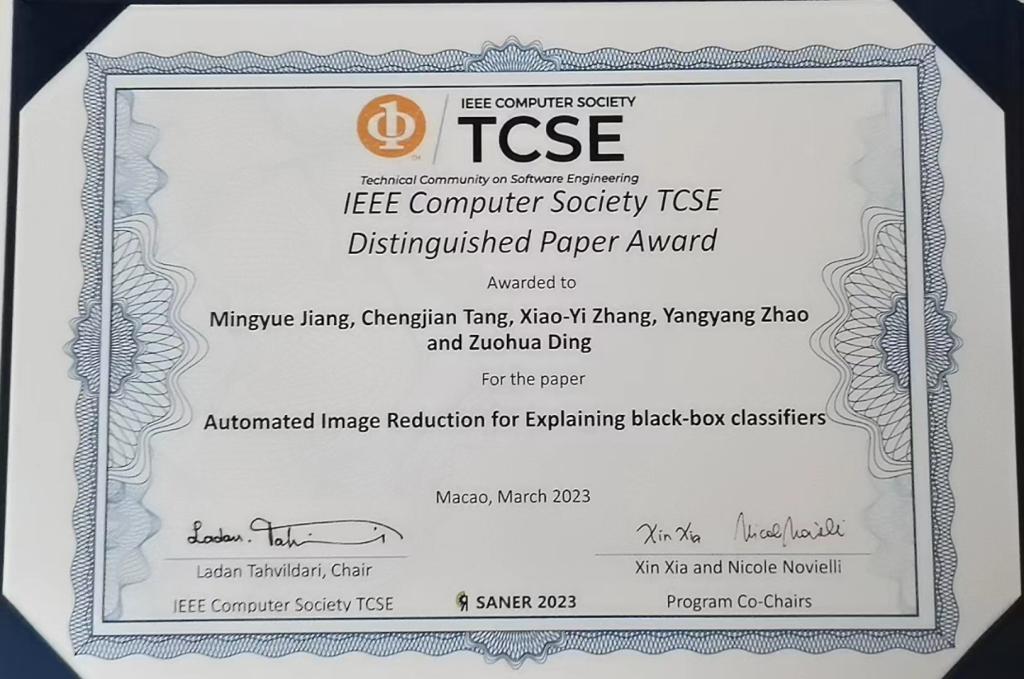 近日,计算机科学与技术学院(人工智能学院)丁佐华教授团队教师江明月副教授、赵泱泱副教授、丁佐华教授获第30届软件分析、演化和重构国际会议(30thIEEE International Conference onSoftware Analysis, Evolution and Reengineering, SANER 2023)杰出论文奖(IEEE Computer Society Distinguished Paper Award)。