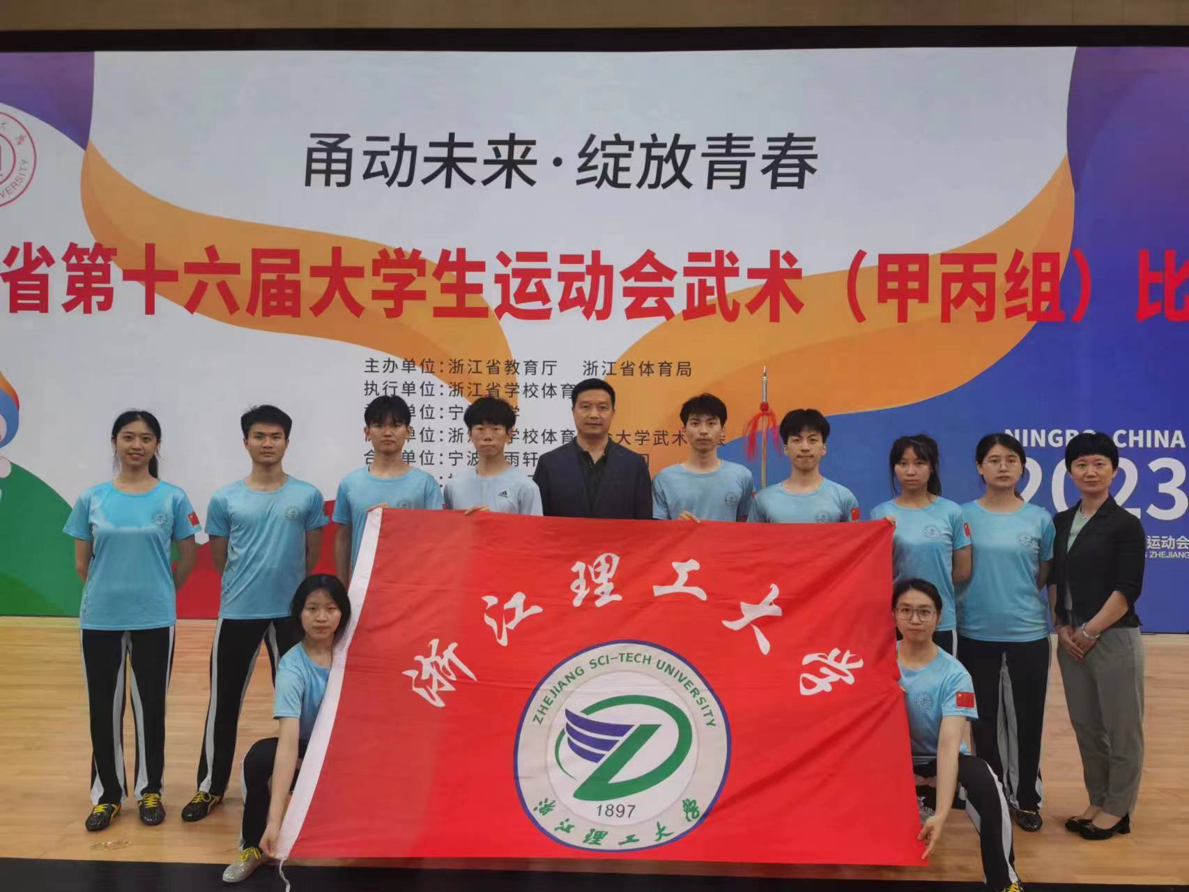 5月11-14日,2023年浙江省大学生运动会武术(甲丙组)比赛在宁波大学举行,本次比赛由浙江省教育厅、浙江省体育局主办,宁波大学承办,共有来自全省38所本科院校的48支代表队、约410名运动员参赛。我校派出体军部副主任(主持工作)惠悲荷老师为领队,尹燕强、杨乃静老师为教练,10名运动员的阵容参赛。