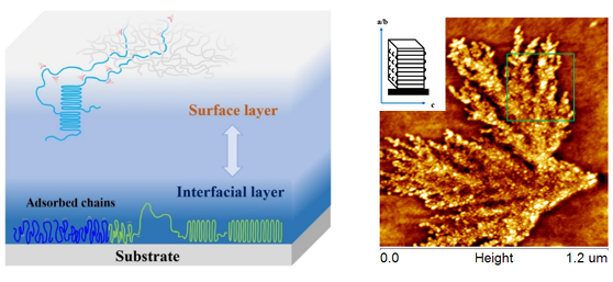 高分子纳米薄膜广泛应用于纳米芯片、微流控、电子封装等领域。纳米高分子薄膜的物理性质与宏观材料存在很大差异,其微观分子运动、结晶和流变等受到表面和界面的影响而发生变化。随着薄膜厚度降低,与空气接触的表面以及基底附近界面区域的占比增大;导致纳米薄膜的结晶行为很大程度上受控于表界面效应及其相互作用。例如,表面区域高分子链段运动能力增强造成高分子薄膜在本体玻璃化温度以下仍旧可以结晶;而高分子在基底界面的吸附限制了分子链的扩散和迁移,造成界面区域结晶困难,甚至无法形成结晶。