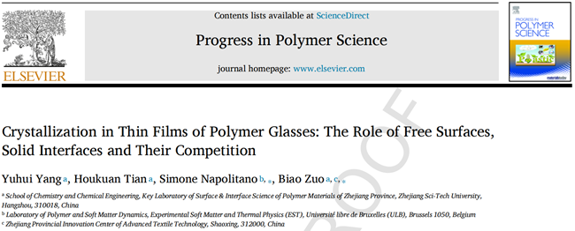 化学与化工学院、浙江省高分子表界面科学重点实验室青年教师阳禹辉博士在国际高分子领域知名期刊Progress in Polymer Science发表了题为“Crystallization in Thin Films of Polymer Glasses: The Role of Free Surfaces, Solid Interfaces and Their Competition”的长篇综述文章,左彪教授与比利时布鲁塞尔自由大学Simone Napolitano教授为共同通讯作者,我校为第一完成单位。该工作受到国家自然科学基金优秀青年基金、面上项目、青年基金以及浙江省自然科学基金的资助。
