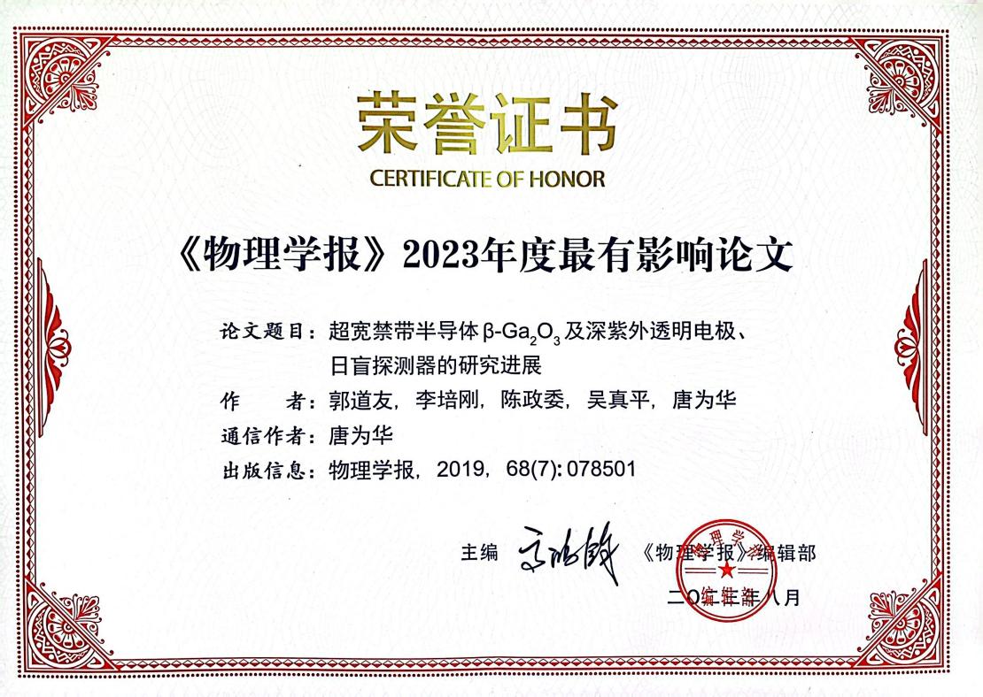 8月18日,中国物理学会秋季学术会议在宁夏召开。会上,mk官方网站_mk(中国)为第一单位、理学院物理学系郭道友特聘教授为第一作者发表的综述文章《超宽禁带半导体β-Ga2O3及深紫外透明电极、日盲探测器的研究进展》[物理学报, 2019, 68(7): 078501.doi: 10.7498/aps.68.20181845] 荣获“《物理学报》2023年度最有影响论文奖”。